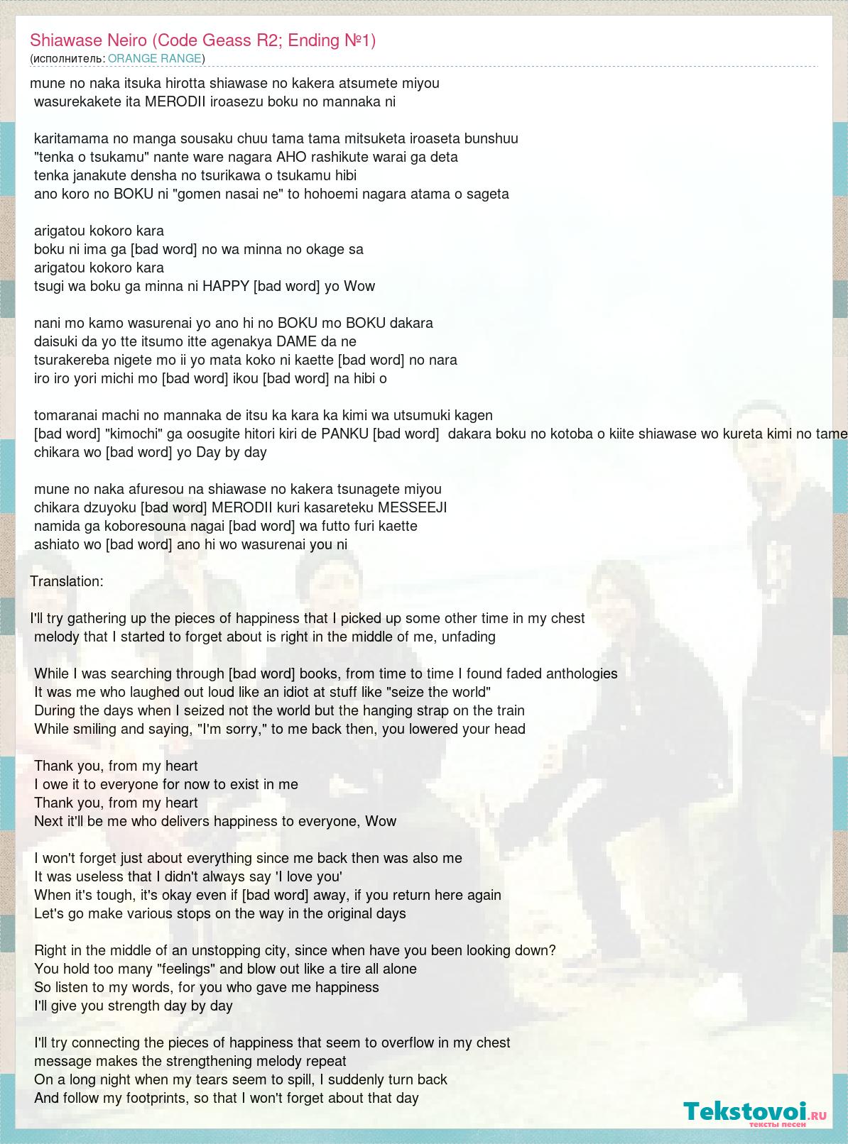 А как ты думаешь, о чем песня "Shiawase Neiro (Code Geass R2; Ending №1)" ?