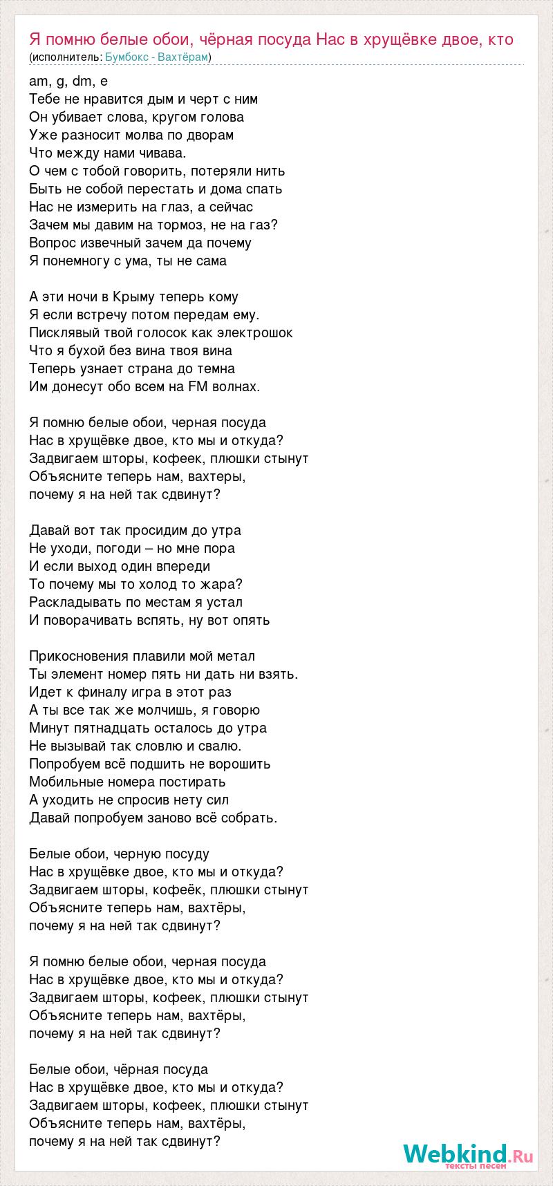 am, g, dm, e Тебе не нравится дым и черт с ним Он убивает слова, кругом голова Уже разносит молва по дворам Что между нами чивава. О чем с тобой говорить, потеряли нить Быть не собой перестать и дома спать Нас не измерить на глаз, а сейчас Зачем мы давим на тормоз, не на газ? Вопрос извечный зачем да почему Я понемногу с ума, ты не сама А эти ночи в Крыму теперь кому Я если встречу потом передам ему. Писклявый твой голосок как электрошок Что я бухой без вина твоя вина Теперь узнает страна до темна Им донесут обо всем на FM волнах. Я помню белые обои, черная посуда Нас в хрущёвке двое, кто мы и откуда? Задвигаем шторы, кофеек, плюшки стынут Объясните теперь нам, вахтеры, почему я на ней так сдвинут? Давай вот так просидим до утра Не уходи, погоди – но мне пора И если выход один впереди То почему мы то холод то жара? Раскладывать по местам я устал И поворачивать вспять, ну вот опять Прикосновения плавили мой метал Ты элемент номер пять ни дать ни взять. Идет к финалу игра в этот раз А ты все так же молчишь, я говорю Минут пятнадцать осталось до утра Не вызывай так словлю и свалю. Попробуем всё подшить не ворошить Мобильные номера постирать А уходить не спросив нету сил Давай попробуем заново всё собрать. Белые обои, черную посуду Нас в хрущёвке двое, кто мы и откуда? Задвигаем шторы, кофеёк, плюшки стынут Объясните теперь нам, вахтёры, почему я на ней так сдвинут? Я помню белые обои, черная посуда Нас в хрущёвке двое, кто мы и откуда? Задвигаем шторы, кофеек, плюшки стынут Объясните теперь нам, вахтёры, почему я на ней так сдвинут? Белые обои, чёрная посуда Нас в хрущёвке двое, кто мы и откуда? Задвигаем шторы, кофеек, плюшки стынут Объясните теперь нам, вахтёры, почему я на ней так сдвинут?