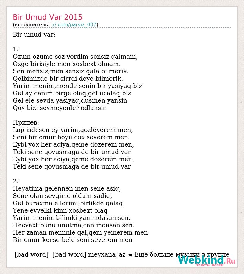 Bir umud var: 1: Ozum ozume soz verdim sensiz qalmam, Ozge birisiyle men xosbext olmam. Sen mensiz,men sensiz qala bilmerik. Qelbimizde bir sirrdi deye bilmerik. Yarim menim,mende senin bir yasiyaq biz Gel ay canim birge olaq,gel ucalaq biz Gel ele sevda yasiyaq,dusmen yansin Qoy bizi sevmeyenler odlansin Припев: Lap isdesen ey yarim,gozleyerem men, Seni bir omur boyu cox severem men. Eybi yox her aciya,qeme dozerem men, Teki sene qovusmaga de bir umud var Eybi yox her aciya,qeme dozerem men, Teki sene qovusmaga de bir umud var 2: Heyatima gelennen men sene asiq, Sene olan sevgime oldum sadiq, Gel buraxma ellerimi,birlikde qalaq Yene evvelki kimi xosbext olaq Yarim menim bilimki yanimdasan sen. Hecvaxt bunu unutma,canimdasan sen. Her zaman menimle qal,qem yemerem men Bir omur kecse bele seni severem men [bad word] [bad word] meyxana_az ◄ Еще больше музыки в группе