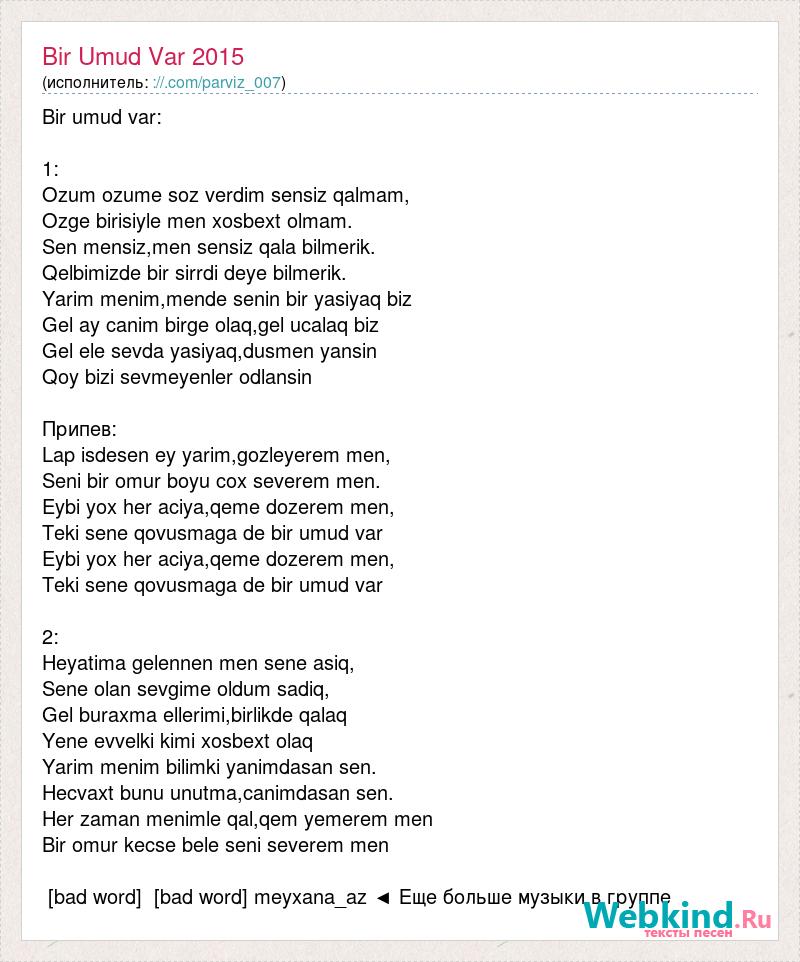 Bir umud var: 1: Ozum ozume soz verdim sensiz qalmam, Ozge birisiyle men xosbext olmam. Sen mensiz,men sensiz qala bilmerik. Qelbimizde bir sirrdi deye bilmerik. Yarim menim,mende senin bir yasiyaq biz Gel ay canim birge olaq,gel ucalaq biz Gel ele sevda yasiyaq,dusmen yansin Qoy bizi sevmeyenler odlansin Припев: Lap isdesen ey yarim,gozleyerem men, Seni bir omur boyu cox severem men. Eybi yox her aciya,qeme dozerem men, Teki sene qovusmaga de bir umud var Eybi yox her aciya,qeme dozerem men, Teki sene qovusmaga de bir umud var 2: Heyatima gelennen men sene asiq, Sene olan sevgime oldum sadiq, Gel buraxma ellerimi,birlikde qalaq Yene evvelki kimi xosbext olaq Yarim menim bilimki yanimdasan sen. Hecvaxt bunu unutma,canimdasan sen. Her zaman menimle qal,qem yemerem men Bir omur kecse bele seni severem men [bad word] [bad word] meyxana_az ◄ Еще больше музыки в группе