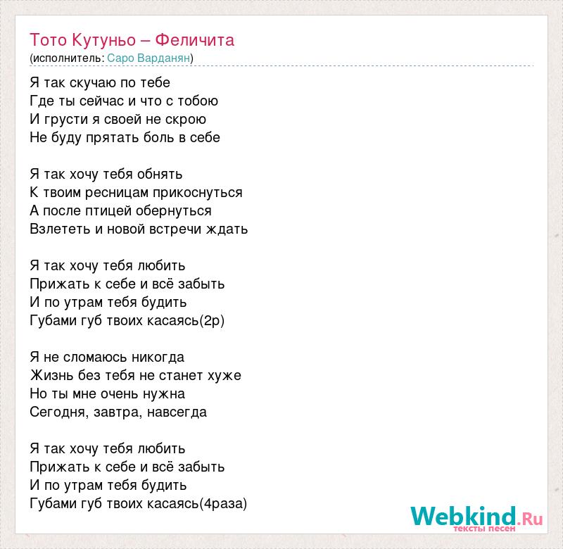 Я так скучаю по тебе Где ты сейчас и что с тобою И грусти я своей не скрою Не буду прятать боль в себе Я так хочу тебя обнять К твоим ресницам прикоснуться А после птицей обернуться Взлететь и новой встречи ждать Я так хочу тебя любить Прижать к себе и всё забыть И по утрам тебя будить Губами губ твоих касаясь(2р) Я не сломаюсь никогда Жизнь без тебя не станет хуже Но ты мне очень нужна Сегодня, завтра, навсегда Я так хочу тебя любить Прижать к себе и всё забыть И по утрам тебя будить Губами губ твоих касаясь(4раза)