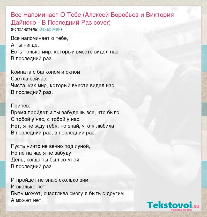 Главная→Исполнители→Захар Май→Все Напоминает О Тебе (Алексей Воробьев и Виктория Дайнеко - В Последний