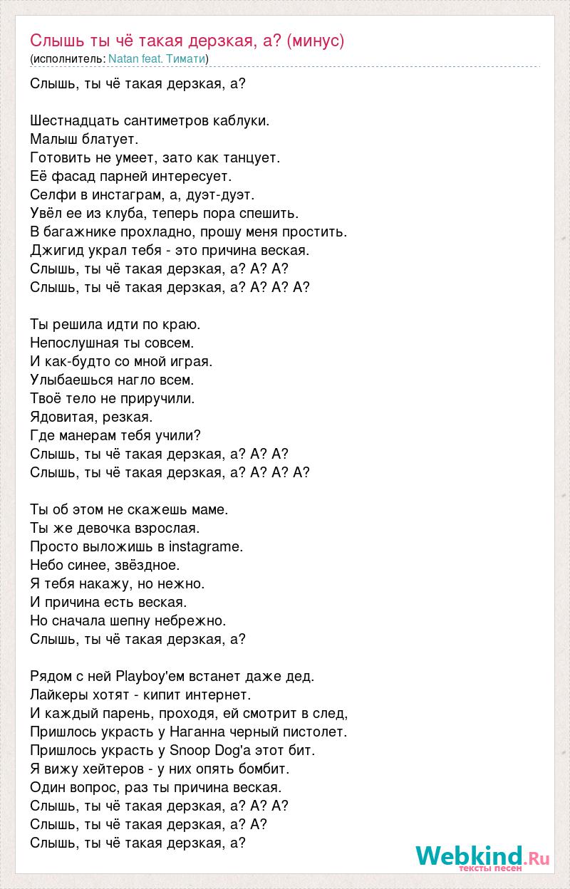 Слышь, ты чё такая дерзкая, а? Шестнадцать сантиметров каблуки. Малыш блатует. Готовить не умеет, зато как танцует. Её фасад парней интересует. Селфи в инстаграм, а, дуэт-дуэт. Увёл ее из клуба, теперь пора спешить. В багажнике прохладно, прошу меня простить. Джигид украл тебя - это причина веская. Слышь, ты чё такая дерзкая, а? А? А? Слышь, ты чё такая дерзкая, а? А? А? А? Ты решила идти по краю. Непослушная ты совсем. И как-будто со мной играя. Улыбаешься нагло всем. Твоё тело не приручили. Ядовитая, резкая. Где манерам тебя учили? Слышь, ты чё такая дерзкая, а? А? А? Слышь, ты чё такая дерзкая, а? А? А? А? Ты об этом не скажешь маме. Ты же девочка взрослая. Просто выложишь в instagramе. Небо синее, звёздное. Я тебя накажу, но нежно. И причина есть веская. Но сначала шепну небрежно. Слышь, ты чё такая дерзкая, а? Рядом с ней Plаyboy'ем встанет даже дед. Лайкеры хотят - кипит интернет. И каждый парень, проходя, ей смотрит в след, Пришлось украсть у Наганна черный пистолет. Пришлось украсть у Snoop Dog'а этот бит. Я вижу хейтеров - у них опять бомбит. Один вопрос, раз ты причина веская. Слышь, ты чё такая дерзкая, а? А? А? Слышь, ты чё такая дерзкая, а? А? Слышь, ты чё такая дерзкая, а?