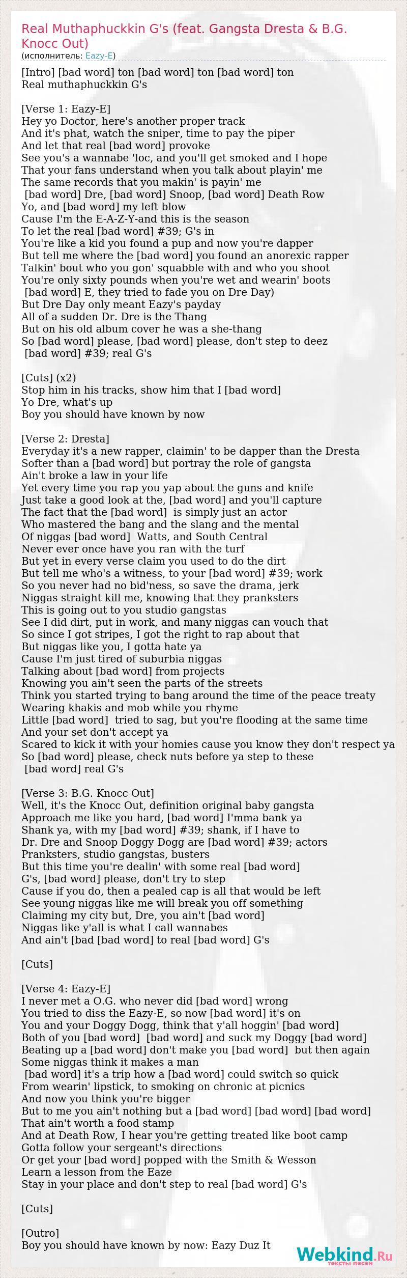 [Intro] [bad word] ton [bad word] ton [bad word] ton Real muthaphuckkin G's [Verse 1: Eazy-E] Hey yo Doctor, here's another proper track And it's phat, watch the sniper, time to pay the piper And let that real [bad word] provoke See you's a wannabe 'loc, and you'll get smoked and I hope That your fans understand when you talk about playin' me The same records that you makin' is payin' me [bad word] Dre, [bad word] Snoop, [bad word] Death Row Yo, and [bad word] my left blow Cause I'm the E-A-Z-Y-and this is the season To let the real [bad word] #39; G's in You're like a kid you found a pup and now you're dapper But tell me where the [bad word] you found an anorexic rapper Talkin' bout who you gon' squabble with and who you shoot You're only sixty pounds when you're wet and wearin' boots [bad word] E, they tried to fade you on Dre Day) But Dre Day only meant Eazy's payday All of a sudden Dr. Dre is the Thang But on his old album cover he was a she-thang So [bad word] please, [bad word] please, don't step to deez [bad word] #39; real G's [Cuts] (x2) Stop him in his tracks, show him that I [bad word] Yo Dre, what's up Boy you should have known by now [Verse 2: Dresta] Everyday it's a new rapper, claimin' to be dapper than the Dresta Softer than a [bad word] but portray the role of gangsta Ain't broke a law in your life Yet every time you rap you yap about the guns and knife Just take a good look at the, [bad word] and you'll capture The fact that the [bad word] is simply just an actor Who mastered the bang and the slang and the mental Of niggas [bad word] Watts, and South Central Never ever once have you ran with the turf But yet in every verse claim you used to do the dirt But tell me who's a witness, to your [bad word] #39; work So you never had no bid'ness, so save the drama, jerk Niggas straight kill me, knowing that they pranksters This is going out to you studio gangstas See I did dirt, put in work, and many niggas can vouch that So since I got stripes, I got the right to rap about that But niggas like you, I gotta hate ya Cause I'm just tired of suburbia niggas Talking about [bad word] from projects Knowing you ain't seen the parts of the streets Think you started trying to bang around the time of the peace treaty Wearing khakis and mob while you rhyme Little [bad word] tried to sag, but you're flooding at the same time And your set don't accept ya Scared to kick it with your homies cause you know they don't respect ya So [bad word] please, check nuts before ya step to these [bad word] real G's [Verse 3: B.G. Knocc Out] Well, it's the Knocc Out, definition original baby gangsta Approach me like you hard, [bad word] I'mma bank ya Shank ya, with my [bad word] #39; shank, if I have to Dr. Dre and Snoop Doggy Dogg are [bad word] #39; actors Pranksters, studio gangstas, busters But this time you're dealin' with some real [bad word] G's, [bad word] please, don't try to step Cause if you do, then a pealed cap is all that would be left See young niggas like me will break you off something Claiming my city but, Dre, you ain't [bad word] Niggas like y'all is what I call wannabes And ain't [bad [bad word] to real [bad word] G's [Cuts] [Verse 4: Eazy-E] I never met a O.G. who never did [bad word] wrong You tried to diss the Eazy-E, so now [bad word] it's on You and your Doggy Dogg, think that y'all hoggin' [bad word] Both of you [bad word] [bad word] and suck my Doggy [bad word] Beating up a [bad word] don't make you [bad word] but then again Some niggas think it makes a man [bad word] it's a trip how a [bad word] could switch so quick From wearin' lipstick, to smoking on chronic at picnics And now you think you're bigger But to me you ain't nothing but a [bad word] [bad word] [bad word] That ain't worth a food stamp And at Death Row, I hear you're getting treated like boot camp Gotta follow your sergeant's directions Or get your [bad word] popped with the Smith & Wesson Learn a lesson from the Eaze Stay in your place and don't step to real [bad word] G's [Cuts] [Outro] Boy you should have known by now: Eazy Duz It