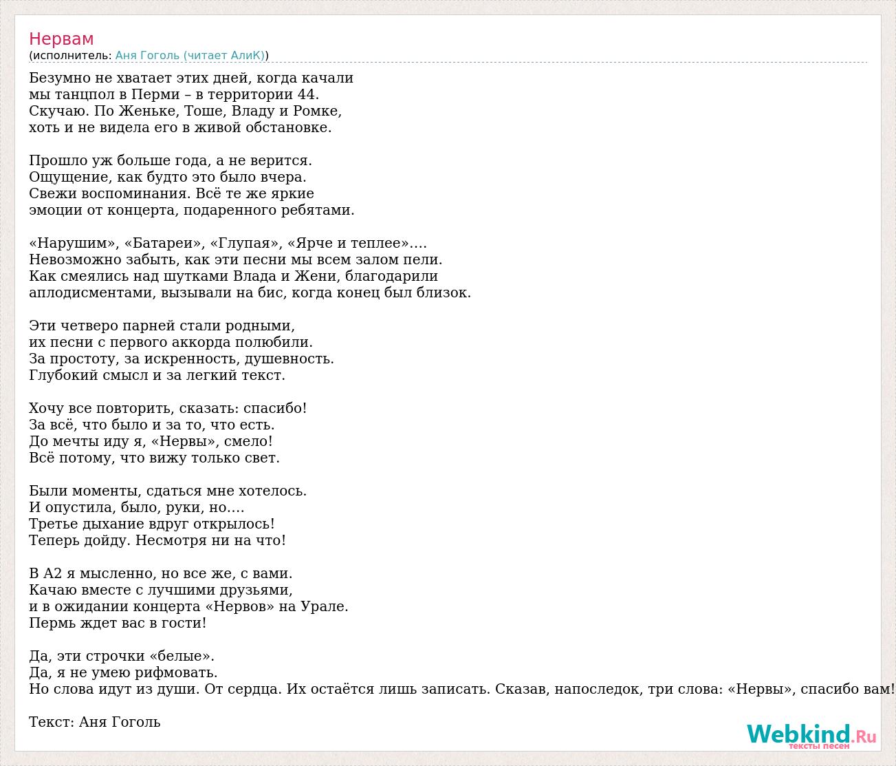 Безумно не хватает этих дней, когда качали мы танцпол в Перми – в территории 44. Скучаю. По Женьке, Тоше, Владу и Ромке, хоть и не видела его в живой обстановке. Прошло уж больше года, а не верится. Ощущение, как будто это было вчера. Свежи воспоминания. Всё те же яркие эмоции от концерта, подаренного ребятами. «Нарушим», «Батареи», «Глупая», «Ярче и теплее»…. Невозможно забыть, как эти песни мы всем залом пели. Как смеялись над шутками Влада и Жени, благодарили аплодисментами, вызывали на бис, когда конец был близок. Эти четверо парней стали родными, их песни с первого аккорда полюбили. За простоту, за искренность, душевность. Глубокий смысл и за легкий текст. Хочу все повторить, сказать: спасибо! За всё, что было и за то, что есть. До мечты иду я, «Нервы», смело! Всё потому, что вижу только свет. Были моменты, сдаться мне хотелось. И опустила, было, руки, но…. Третье дыхание вдруг открылось! Теперь дойду. Несмотря ни на что! В А2 я мысленно, но все же, с вами. Качаю вместе с лучшими друзьями, и в ожидании концерта «Нервов» на Урале. Пермь ждет вас в гости! Да, эти строчки «белые». Да, я не умею рифмовать. Но слова идут из души. От сердца. Их остаётся лишь записать. Сказав, напоследок, три слова: «Нервы», спасибо вам! Текст: Аня Гоголь