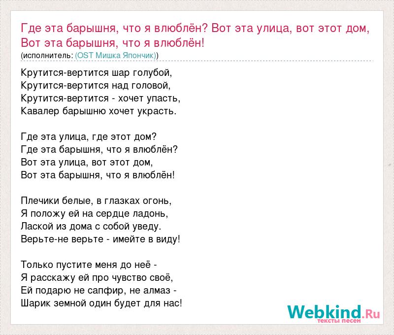 Крутится-вертится шар голубой, Крутится-вертится над головой, Крутится-вертится - хочет упасть, Кавалер барышню хочет украсть. Где эта улица, где этот дом? Где эта барышня, что я влюблён? Вот эта улица, вот этот дом, Вот эта барышня, что я влюблён! Плечики белые, в глазках огонь, Я положу ей на сердце ладонь, Лаской из дома с собой уведу. Верьте-не верьте - имейте в виду! Только пустите меня до неё - Я расскажу ей про чувство своё, Ей подарю не сапфир, не алмаз - Шарик земной один будет для нас!