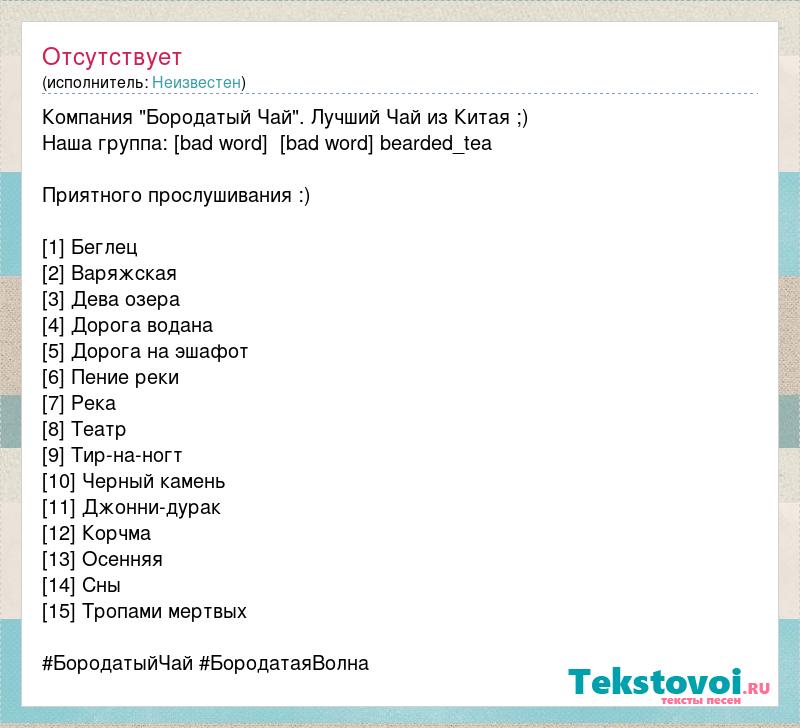 Компания "Бородатый Чай". Лучший Чай из Китая ;) Наша группа: [bad word] [bad word] bearded_tea Приятного прослушивания :) [1] Беглец [2] Варяжская [3] Дева озера [4] Дорога водана [5] Дорога на эшафот [6] Пение реки [7] Река [8] Театр [9] Тир-на-ногт [10] Черный камень [11] Джонни-дурак [12] Корчма [13] Осенняя [14] Сны [15] Тропами мертвых #БородатыйЧай #БородатаяВолна
