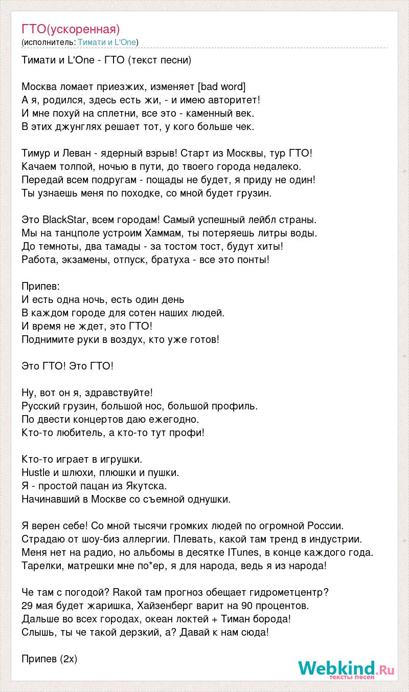 Тимати и L'One - ГТО (текст песни) Москва ломает приезжих, изменяет [bad word] А я, родился, здесь есть жи, - и имею авторитет! И мне похуй на сплетни, все это - каменный век. В этих джунглях решает тот, у кого больше чек. Тимур и Леван - ядерный взрыв! Старт из Москвы, тур ГТО! Качаем толпой, ночью в пути, до твоего города недалеко. Передай всем подругам - пощады не будет, я приду не один! Ты узнаешь меня по походке, со мной будет грузин. Это BlackStar, всем городам! Самый успешный лейбл страны. Мы на танцполе устроим Хаммам, ты потеряешь литры воды. До темноты, два тамады - за тостом тост, будут хиты! Работа, экзамены, отпуск, братуха - все это понты! Припев: И есть одна ночь, есть один день В каждом городе для сотен наших людей. И время не ждет, это ГТО! Поднимите руки в воздух, кто уже готов! Это ГТО! Это ГТО! Ну, вот он я, здравствуйте! Русский грузин, большой нос, большой профиль. По двести концертов даю ежегодно. Кто-то любитель, а кто-то тут профи! Кто-то играет в игрушки. Hustle и шлюхи, плюшки и пушки. Я - простой пацан из Якутска. Начинавший в Москве со съемной однушки. Я верен себе! Со мной тысячи громких людей по огромной России. Страдаю от шоу-биз аллергии. Плевать, какой там тренд в индустрии. Меня нет на радио, но альбомы в десятке ITunes, в конце каждого года. Тарелки, матрешки мне по*ер, я для народа, ведь я из народа! Че там с погодой? Rакой там прогноз обещает гидрометцентр? 29 мая будет жаришка, Хайзенберг варит на 90 процентов. Дальше во всех городах, океан локтей + Тиман борода! Слышь, ты че такой дерзкий, а? Давай к нам сюда! Припев (2x)