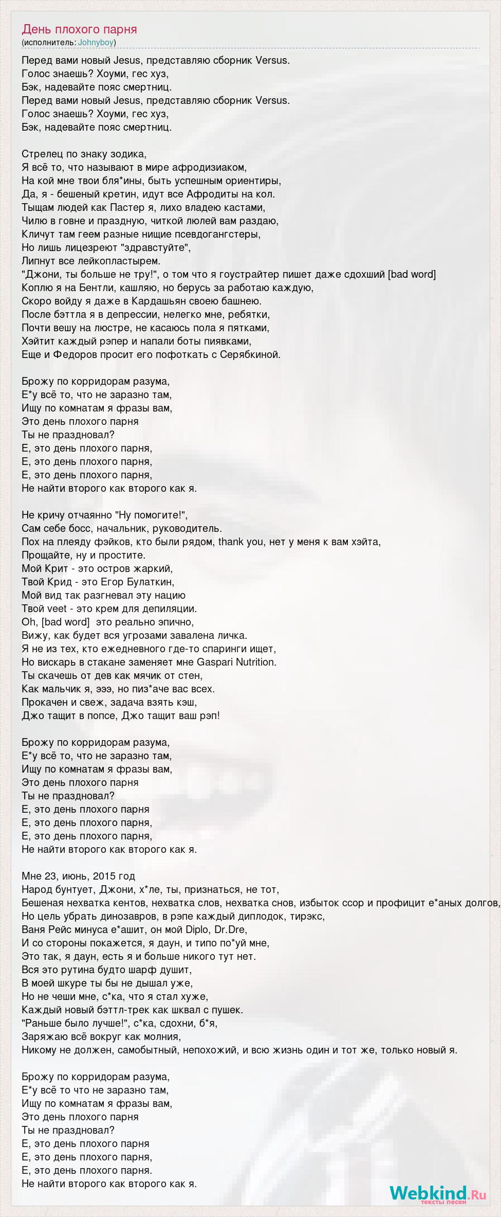 Перед вами новый Jesus, представляю сборник Versus. Голос знаешь? Хоуми, гес хуз, Бэк, надевайте пояс смертниц. Перед вами новый Jesus, представляю сборник Versus. Голос знаешь? Хоуми, гес хуз, Бэк, надевайте пояс смертниц. Стрелец по знаку зодика, Я всё то, что называют в мире афродизиаком, На кой мне твои бля*ины, быть успешным ориентиры, Да, я - бешеный кретин, идут все Афродиты на кол. Тыщам людей как Пастер я, лихо владею кастами, Чилю в говне и праздную, читкой люлей вам раздаю, Кличут там геем разные нищие псевдогангстеры, Но лишь лицезреют "здравстуйте", Липнут все лейкопластырем. "Джони, ты больше не тру!", о том что я гоустрайтер пишет даже сдохший [bad word] Коплю я на Бентли, кашляю, но берусь за работаю каждую, Скоро войду я даже в Кардашьян своею башнею. После бэттла я в депрессии, нелегко мне, ребятки, Почти вешу на люстре, не касаюсь пола я пятками, Хэйтит каждый рэпер и напали боты пиявками, Еще и Федоров просит его пофоткать с Серябкиной. Брожу по корридорам разума, Е*у всё то, что не заразно там, Ищу по комнатам я фразы вам, Это день плохого парня Ты не праздновал? Е, это день плохого парня, Е, это день плохого парня, Е, это день плохого парня, Не найти второго как второго как я. Не кричу отчаянно "Ну помогите!", Сам себе босс, начальник, руководитель. Пох на плеяду фэйков, кто были рядом, thank you, нет у меня к вам хэйта, Прощайте, ну и простите. Мой Крит - это остров жаркий, Твой Крид - это Егор Булаткин, Мой вид так разгневал эту нацию Твой veet - это крем для депиляции. Oh, [bad word] это реально эпично, Вижу, как будет вся угрозами завалена личка. Я не из тех, кто ежедневного где-то спаринги ищет, Но вискарь в стакане заменяет мне Gaspari Nutrition. Ты скачешь от дев как мячик от стен, Как мальчик я, эээ, но пиз*аче вас всех. Прокачен и свеж, задача взять кэш, Джо тащит в попсе, Джо тащит ваш рэп! Брожу по корридорам разума, Е*у всё то, что не заразно там, Ищу по комнатам я фразы вам, Это день плохого парня Ты не праздновал? Е, это день плохого парня Е, это день плохого парня, Е, это день плохого парня, Не найти второго как второго как я. Мне 23, июнь, 2015 год Народ бунтует, Джони, х*ле, ты, признаться, не тот, Бешеная нехватка кентов, нехватка слов, нехватка снов, избыток ссор и профицит е*аных долгов, Но цель убрать динозавров, в рэпе каждый диплодок, тирэкс, Ваня Рейс минуса е*ашит, он мой Diplo, Dr.Dre, И со стороны покажется, я даун, и типо по*уй мне, Это так, я даун, есть я и больше никого тут нет. Вся это рутина будто шарф душит, В моей шкуре ты бы не дышал уже, Но не чеши мне, с*ка, что я стал хуже, Каждый новый бэттл-трек как шквал с пушек. "Раньше было лучше!", с*ка, сдохни, б*я, Заряжаю всё вокруг как молния, Никому не должен, самобытный, непохожий, и всю жизнь один и тот же, только новый я. Брожу по корридорам разума, Е*у всё то что не заразно там, Ищу по комнатам я фразы вам, Это день плохого парня Ты не праздновал? Е, это день плохого парня Е, это день плохого парня, Е, это день плохого парня. Не найти второго как второго как я.