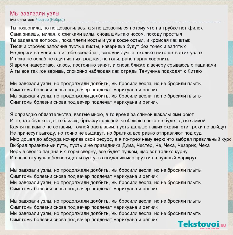 Ты позвонила, но не дозвонилась, а я не дозвонился потому-что на трубке нет филок Сама знаешь, милая, с филками вилы, снова шмыгаю носом, походу простыл Ты задавала вопросы, пока тлели мосты и уже кофе остыл, и кромсая как штык Тысячи строчек заполнив пустые листы, наверняка будут без точек и запятых Не держи на меня зла и тебе всех благ, вспомни лучше, сколько ниточек в этих узлах И пока не ослаб не один из них, родная, не гони, рано парня хоронить Я время наверстаю, каюсь, постоянно занят, и снова ближе к вечеру срываюсь с пацанами А ты все так же веришь, спокойно наблюдая как отряды Темучина подходят к Китаю Мы завязали узлы, но продолжали долбить, мы бросили весла, но не бросили плыть Симптомы болезни снова под вечер подлечат марихуана и рэпчик Мы завязали узлы, но продолжали долбить, мы бросили весла, но не бросили плыть Симптомы болезни снова под вечер подлечат марихуана и рэпчик Я оправдаю обязательства, взятые мною, в то время за спиной шакалы ямы роют И те, кто был когда-то близок, брызжут слюной, я обещаю снега не будет даже зимой Камня на камне не оставим, точней расплавим, пусть дальше наших окраин эти треки не выйдут Не принесут выгоду, но точно не выдадут, но братика все равно отправляют под суд Мир дошел до абсурда исчерпав свой ресурс, а я по-прежнему верю что выбрал правильный курс Выбрал правильный путь, пусть и не праведника Дима, Честер, Че, Чека, Чезарик, Чека Верь в своего пацана и я горы сверну, все будет пучком, щас вот только курну И вновь окунусь в беспорядок и суету, в ожидании маршрутки на нужный маршрут Мы завязали узлы, но продолжали долбить, мы бросили весла, но не бросили плыть Симптомы болезни снова под вечер подлечат марихуана и рэпчик Мы завязали узлы, но продолжали долбить, мы бросили весла, но не бросили плыть Симптомы болезни снова под вечер подлечат марихуана и рэпчик Мы завязали узлы, но продолжали долбить, мы бросили весла, но не бросили плыть Симптомы болезни снова под вечер подлечат марихуана и рэпчик Мы завязали узлы, но продолжали долбить, мы бросили весла, но не бросили плыть Симптомы болезни снова под вечер подлечат марихуана и рэпчик