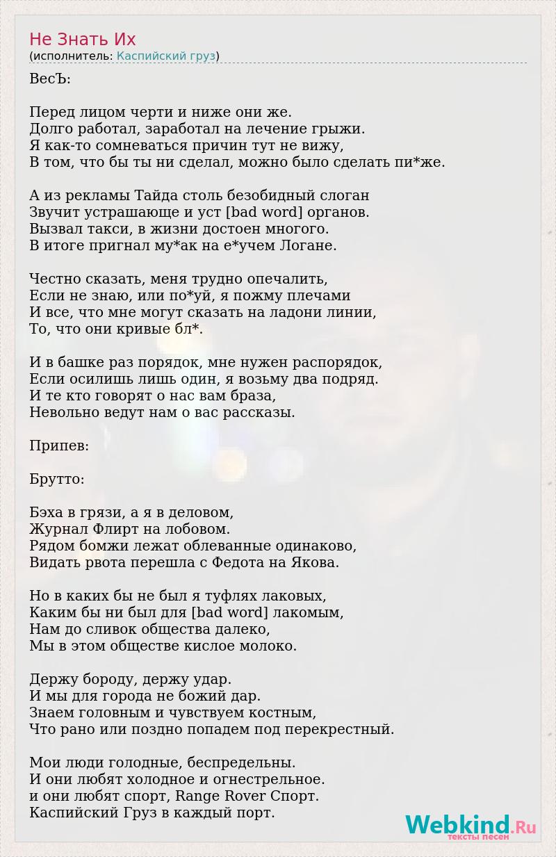 ВесЪ: Перед лицом черти и ниже они же. Долго работал, заработал на лечение грыжи. Я как-то сомневаться причин тут не вижу, В том, что бы ты ни сделал, можно было сделать пи*же. А из рекламы Тайда столь безобидный слоган Звучит устрашающе и уст [bad word] органов. Вызвал такси, в жизни достоен многого. В итоге пригнал му*ак на е*учем Логане. Честно сказать, меня трудно опечалить, Если не знаю, или по*уй, я пожму плечами И все, что мне могут сказать на ладони линии, То, что они кривые бл*. И в башке раз порядок, мне нужен распорядок, Если осилишь лишь один, я возьму два подряд. И те кто говорят о нас вам браза, Невольно ведут нам о вас рассказы. Припев: Брутто: Бэха в грязи, а я в деловом, Журнал Флирт на лобовом. Рядом бомжи лежат облеванные одинаково, Видать рвота перешла с Федота на Якова. Но в каких бы не был я туфлях лаковых, Каким бы ни был для [bad word] лакомым, Нам до сливок общества далеко, Мы в этом обществе кислое молоко. Держу бороду, держу удар. И мы для города не божий дар. Знаем головным и чувствуем костным, Что рано или поздно попадем под перекрестный. Мои люди голодные, беспредельны. И они любят холодное и огнестрельное. и они любят спорт, Range Rover Спорт. Каспийский Груз в каждый порт.