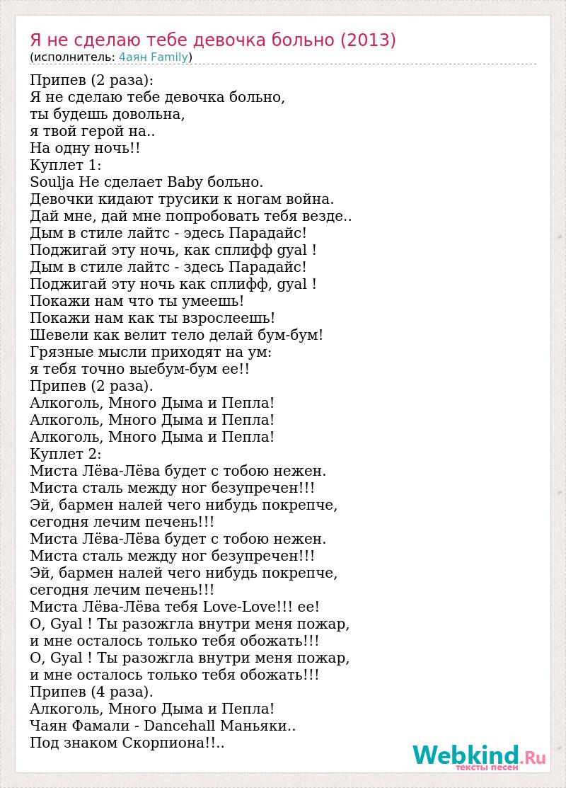 Припев (2 раза): Я не сделаю тебе девочка больно, ты будешь довольна, я твой герой на.. На одну ночь!! Куплет 1: Soulja Не сделает Baby больно. Девочки кидают трусики к ногам война. Дай мне, дай мне попробовать тебя везде.. Дым в стиле лайтс - эдесь Парадайс! Поджигай эту ночь, как сплифф gyal ! Дым в стиле лайтс - здесь Парадайс! Поджигай эту ночь как сплифф, gyal ! Покажи нам что ты умеешь! Покажи нам как ты взрослеешь! Шевели как велит тело делай бум-бум! Грязные мысли приходят на ум: я тебя точно выебум-бум ее!! Припев (2 раза). Алкоголь, Много Дыма и Пепла! Алкоголь, Много Дыма и Пепла! Алкоголь, Много Дыма и Пепла! Куплет 2: Миста Лёва-Лёва будет с тобою нежен. Миста сталь между ног безупречен!!! Эй, бармен налей чего нибудь покрепче, сегодня лечим печень!!! Миста Лёва-Лёва будет с тобою нежен. Миста сталь между ног безупречен!!! Эй, бармен налей чего нибудь покрепче, сегодня лечим печень!!! Миста Лёва-Лёва тебя Love-Love!!! ее! O, Gyal ! Ты разожгла внутри меня пожар, и мне осталось только тебя обожать!!! O, Gyal ! Ты разожгла внутри меня пожар, и мне осталось только тебя обожать!!! Припев (4 раза). Алкоголь, Много Дыма и Пепла! Чаян Фамали - Dancehall Маньяки.. Под знаком Скорпиона!!..