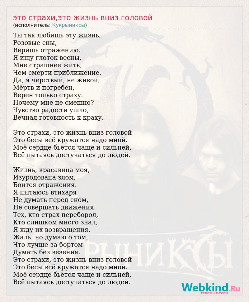 Ты так любишь эту жизнь, Розовые сны, Веришь отражению. Я ищу глоток весны, Мне страшнее жить, Чем смерти приближение. Да, я черствый, не живой, Мёртв и погребён, Верен только страху. Почему мне не смешно? Чувство радости ушло, Вечная готовность к краху. Это страхи, это жизнь вниз головой Это бесы всё кружатся надо мной. Моё сердце бьётся чаще и сильней, Всё пытаясь достучаться до людей. Жизнь, красавица моя, Изуродована злом, Боится отражения. Я пытаюсь втихаря Не думать перед сном, Не совершать движения. Тех, кто страх переборол, Кто слишком много знал, Я жду их возвращения. Жаль, но думаю о том, Что лучше за бортом Думать без везения. Это страхи, это жизнь вниз головой Это бесы всё кружатся надо мной. Моё сердце бьётся чаще и сильней, Всё пытаясь достучаться до людей.