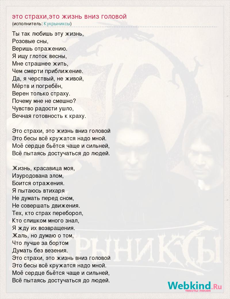 Ты так любишь эту жизнь, Розовые сны, Веришь отражению. Я ищу глоток весны, Мне страшнее жить, Чем смерти приближение. Да, я черствый, не живой, Мёртв и погребён, Верен только страху. Почему мне не смешно? Чувство радости ушло, Вечная готовность к краху. Это страхи, это жизнь вниз головой Это бесы всё кружатся надо мной. Моё сердце бьётся чаще и сильней, Всё пытаясь достучаться до людей. Жизнь, красавица моя, Изуродована злом, Боится отражения. Я пытаюсь втихаря Не думать перед сном, Не совершать движения. Тех, кто страх переборол, Кто слишком много знал, Я жду их возвращения. Жаль, но думаю о том, Что лучше за бортом Думать без везения. Это страхи, это жизнь вниз головой Это бесы всё кружатся надо мной. Моё сердце бьётся чаще и сильней, Всё пытаясь достучаться до людей.