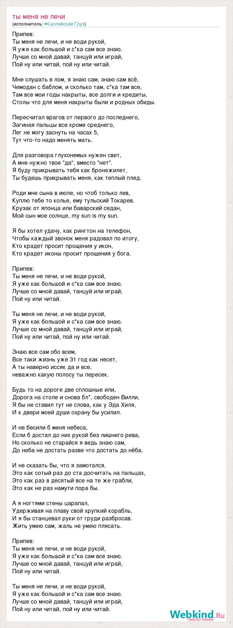 Припев: Ты меня не лечи, и не води рукой, Я уже как большой и с*ка сам все знаю. Лучше со мной давай, танцуй или играй, Пой ну или читай, пой ну или читай. Мне слушать в лом, я знаю сам, знаю сам всё, Чемодан с баблом, и сколько там, с*ка там все, Там все мои годы накрыты, все долги и кредиты, Столы что для меня накрыты были и родных обиды. Пересчитал врагов от первого до последнего, Загиная пальцы все кроме среднего, Лег не могу заснуть на часах 5, Тут что-то надо менять мать. Для разговора глухонемых нужен свет, А мне нужно твое "да", вместо "нет". Я буду прикрывать тебя как бронежилет, Ты будешь прикрывать меня, как теплый плед. Роди мне сына в июле, но чтоб только лев, Куплю тебе то колье, ему тульский Токарев. Крузак от японца или баварский седан, Мой сын мое солнце, my sun is my sun. Я бы хотел удачу, как рингтон на телефон, Чтобы каждый звонок меня радовал по итогу, Кто крадет просит прощения у икон, Кто крадет иконы просит прощения у бога. Припев: Ты меня не лечи, и не води рукой, Я уже как большой и с*ка сам все знаю. Лучше со мной давай, танцуй или играй, Пой ну или читай. Ты меня не лечи, и не води рукой, Я уже как большой и с*ка сам все знаю. Лучше со мной давай, танцуй или играй, Пой ну или читай, пой ну или читай. Знаю все сам обо всем, Все таки жизнь уже 31 год как несет, А ты наверно иссяк да и все, неважно какую полосу ты пересек. Будь то на дороге две сплошные или, Дорога на столе и снова бл*, свободен Вилли, Я бы не ставил тут не слова, как у Эда Хиля, И к двери моей души охрану бы усилил. И не бесили б меня небеса, Если б достал до них рукой без лишнего рева, Но сколько не старайся я ведь знаю сам, До неба не достать разве что достать до нёба. И не сказать бы, что я замотался. Это как сотый раз до ста досчитать на пальцах, Это как раз в десятый все на те же грабли, Это как не раз намути пора бы. А я ногтями стены царапал, Удерживая на плаву свой хрупкий корабль, И я бы станцевал руки от груди разбросав. Жить умею сам, жаль не умею плясать. Припев: Ты меня не лечи, и не води рукой, Я уже как большой и с*ка сам все знаю. Лучше со мной давай, танцуй или играй, Пой ну или читай. Ты меня не лечи, и не води рукой, Я уже как большой и с*ка сам все знаю. Лучше со мной давай, танцуй или играй, Пой ну или читай, пой ну или читай.