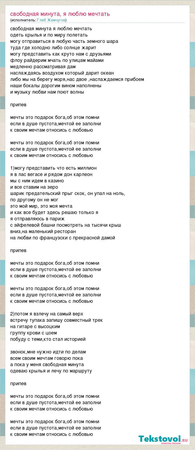 свободная минута я люблю мечтать одеть крылья и по миру полетать могу отправиться в любую часть земного шара туда где холодно либо солнце жарит могу представить как круто нам с друзьями флоу райдерим мчать по улицам майами медленно рассматривая дам наслаждаясь воздухом который дарит океан либо мы на берегу моря,нас двое ,наслаждаемся прибоем наши бокалы дорогим вином наполнены и музыку любви нам поют волны припев мечты это подарок бога,об этом помни если в душе пустота,мечтой ее заполни к своим мечтам относись с любовью мечты это подарок бога,об этом помни если в душе пустота,мечтой ее заполни к своим мечтам относись с любовью 1)могу представить что есть миллион я в лас вегасе и рядом дон карлеон мы с ним идем в казино и все ставим на зеро шарик предательский прыг скок, он упал на ноль, по другому он не мог это мой мир, это моя мечта и как все будет здесь решаю только я я отправляюсь в париж с эйфелевой башни посмотреть на тысячи крыш вниз,на маленький ресторан на любви по французски с прекрасной дамой припев мечты это подарок бога,об этом помни если в душе пустота,мечтой ее заполни к своим мечтам относись с любовью мечты это подарок бога,об этом помни если в душе пустота,мечтой ее заполни к своим мечтам относись с любовью 2)потом я взлечу на самый верх встречу тупака запишу совместный трек на гитаре с высоцким группу крови с цоем побуду с теми,кто стал историей звонок,мне нужно идти по делам всем своим мечтам говорю пока а пока у меня свободная минута одеваю крылья и лечу по маршруту припев мечты это подарок бога,об этом помни если в душе пустота,мечтой ее заполни к своим мечтам относись с любовью мечты это подарок бога,об этом помни если в душе пустота,мечтой ее заполни к своим мечтам относись с любовью