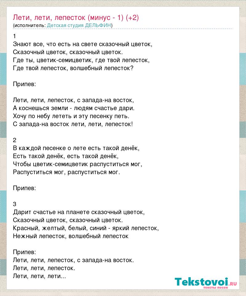 1 Знают все, что есть на свете сказочный цветок, Сказочный цветок, сказочный цветок. Где ты, цветик-семицветик, где твой лепесток, Где твой лепесток, волшебный лепесток? Припев: Лети, лети, лепесток, с запада-на восток, А коснешься земли - людям счастье дари. Хочу по небу лететь и эту песенку петь. С запада-на восток лети, лети, лепесток! 2 В каждой песенке о лете есть такой денёк, Есть такой денёк, есть такой денёк, Чтобы цветик-семицветик распуститься мог, Распуститься мог, распуститься мог. Припев: 3 Дарит счастье на планете сказочный цветок, Сказочный цветок, сказочный цветок. Красный, желтый, белый, синий - яркий лепесток, Нежный лепесток, волшебный лепесток Припев: Лети, лети, лепесток, с запада-на восток. Лети, лети, лепесток. Лети, лети, лети...