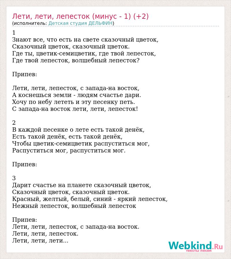 1 Знают все, что есть на свете сказочный цветок, Сказочный цветок, сказочный цветок. Где ты, цветик-семицветик, где твой лепесток, Где твой лепесток, волшебный лепесток? Припев: Лети, лети, лепесток, с запада-на восток, А коснешься земли - людям счастье дари. Хочу по небу лететь и эту песенку петь. С запада-на восток лети, лети, лепесток! 2 В каждой песенке о лете есть такой денёк, Есть такой денёк, есть такой денёк, Чтобы цветик-семицветик распуститься мог, Распуститься мог, распуститься мог. Припев: 3 Дарит счастье на планете сказочный цветок, Сказочный цветок, сказочный цветок. Красный, желтый, белый, синий - яркий лепесток, Нежный лепесток, волшебный лепесток Припев: Лети, лети, лепесток, с запада-на восток. Лети, лети, лепесток. Лети, лети, лети...