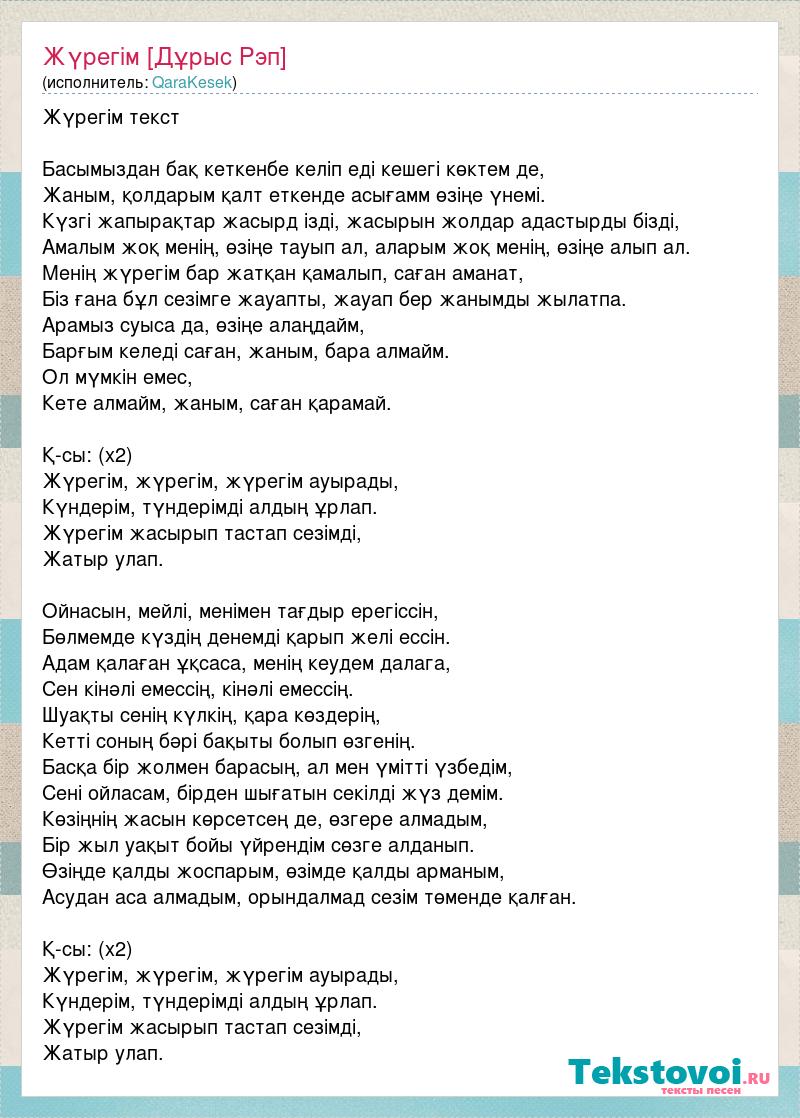 Жүрегім текст Басымыздан бақ кеткенбе келіп еді кешегі көктем де, Жаным, қолдарым қалт еткенде асығамм өзіңе үнемі. Күзгі жапырақтар жасырд ізді, жасырын жолдар адастырды бізді, Амалым жоқ менің, өзіңе тауып ал, аларым жоқ менің, өзіңе алып ал. Менің жүрегім бар жатқан қамалып, саған аманат, Біз ғана бұл сезімге жауапты, жауап бер жанымды жылатпа. Арамыз суыса да, өзіңе алаңдайм, Барғым келеді саған, жаным, бара алмайм. Ол мүмкін емес, Кете алмайм, жаным, саған қарамай. Қ-сы: (х2) Жүрегім, жүрегім, жүрегім ауырады, Күндерім, түндерімді алдың ұрлап. Жүрегім жасырып тастап сезімді, Жатыр улап. Ойнасын, мейлі, менімен тағдыр ерегіссін, Бөлмемде күздің денемді қарып желі ессін. Адам қалаған ұқсаса, менің кеудем далага, Сен кінәлі емессің, кінәлі емессің. Шуақты сенің күлкің, қара көздерің, Кетті соның бәрі бақыты болып өзгенің. Басқа бір жолмен барасың, ал мен үмітті үзбедім, Сені ойласам, бірден шығатын секілді жүз демім. Көзіңнің жасын көрсетсең де, өзгере алмадым, Бір жыл уақыт бойы үйрендім сөзге алданып. Өзіңде қалды жоспарым, өзімде қалды арманым, Асудан аса алмадым, орындалмад сезім төменде қалған. Қ-сы: (х2) Жүрегім, жүрегім, жүрегім ауырады, Күндерім, түндерімді алдың ұрлап. Жүрегім жасырып тастап сезімді, Жатыр улап.