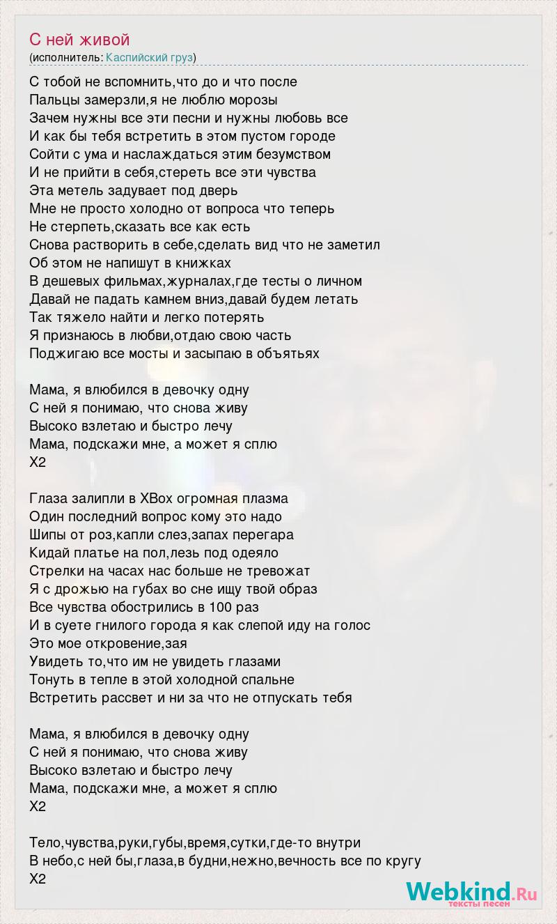 С тобой не вспомнить,что до и что после Пальцы замерзли,я не люблю морозы Зачем нужны все эти песни и нужны любовь все И как бы тебя встретить в этом пустом городе Сойти с ума и наслаждаться этим безумством И не прийти в себя,стереть все эти чувства Эта метель задувает под дверь Мне не просто холодно от вопроса что теперь Не стерпеть,сказать все как есть Снова растворить в себе,сделать вид что не заметил Об этом не напишут в книжках В дешевых фильмах,журналах,где тесты о личном Давай не падать камнем вниз,давай будем летать Так тяжело найти и легко потерять Я признаюсь в любви,отдаю свою часть Поджигаю все мосты и засыпаю в объятьях Мама, я влюбился в девочку одну С ней я понимаю, что снова живу Высоко взлетаю и быстро лечу Мама, подскажи мне, а может я сплю Х2 Глаза залипли в XBox огромная плазма Один последний вопрос кому это надо Шипы от роз,капли слез,запах перегара Кидай платье на пол,лезь под одеяло Стрелки на часах нас больше не тревожат Я с дрожью на губах во сне ищу твой образ Все чувства обострились в 100 раз И в суете гнилого города я как слепой иду на голос Это мое откровение,зая Увидеть то,что им не увидеть глазами Тонуть в тепле в этой холодной спальне Встретить рассвет и ни за что не отпускать тебя Мама, я влюбился в девочку одну С ней я понимаю, что снова живу Высоко взлетаю и быстро лечу Мама, подскажи мне, а может я сплю Х2 Тело,чувства,руки,губы,время,сутки,где-то внутри В небо,с ней бы,глаза,в будни,нежно,вечность все по кругу Х2