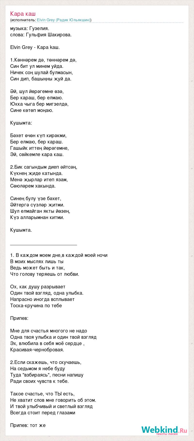 музыка: Гузелия. слова: Гульфия Шакирова. Elvin Grey - Кара kаш. 1.Көннәрем дә, төннәрем дә, Син бит ул минем уйда. Ничек соң шулай булмасын, Син дип, башыңны җуй да. Әй, шул йөрәгемне өзә, Бер караш, бер елмаю. Юкка чыга бер мигзелдә, Сине көтөп моңаю. Кушымта: Бәхет өчөн күп кирәкми, Бер елмаю, бер караш. Гашыйк иттең йөрәгемне, Эй, сөйкемле кара каш. 2.Бик сагындым диеп әйтсәң, Күкнең җиде катында. Менә җырлар итеп язам, Сөюләрем хакында. Синең булу үзе бәхет, Әйтергә сүзләр җитми. Шул елмайган якты йөзең, Күз алларымнан китми. Кушымта. _________________________ 1. В каждом моем дне,в каждой моей ночи В моих мыслях лишь ты Ведь может быть и так, Что голову теряешь от любви. Ох, как душу разрывает Один твой взгляд, одна улыбка. Напрасно иногда всплывает Тоска-кручина по тебе Припев: Мне для счастья многого не надо Одна твоя улыбка и один твой взгляд Эх, влюбила в себя моё сердце , Красивая-чернобровая. 2.Если скажешь, что скучаешь, На седьмом я небе буду Туда "взбираясь", песни напишу Ради своих чувств к тебе. Такое счастье, что ТЫ есть, Не хватит слов мне говорить об этом. И твой улыбчивый и светлый взгляд Всегда стоит перед глазами Припев: тот же