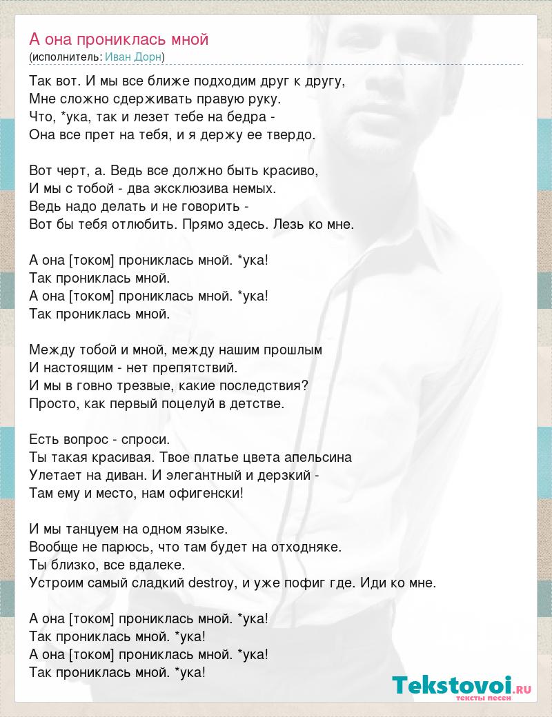 Так вот. И мы все ближе подходим друг к другу, Мне сложно сдерживать правую руку. Что, *ука, так и лезет тебе на бедра - Она все прет на тебя, и я держу ее твердо. Вот черт, а. Ведь все должно быть красиво, И мы с тобой - два эксклюзива немых. Ведь надо делать и не говорить - Вот бы тебя отлюбить. Прямо здесь. Лезь ко мне. А она [током] прониклась мной. *ука! Так прониклась мной. А она [током] прониклась мной. *ука! Так прониклась мной. Между тобой и мной, между нашим прошлым И настоящим - нет препятствий. И мы в говно трезвые, какие последствия? Просто, как первый поцелуй в детстве. Есть вопрос - спроси. Ты такая красивая. Твое платье цвета апельсина Улетает на диван. И элегантный и дерзкий - Там ему и место, нам офигенски! И мы танцуем на одном языке. Вообще не парюсь, что там будет на отходняке. Ты близко, все вдалеке. Устроим самый сладкий destroy, и уже пофиг где. Иди ко мне. А она [током] прониклась мной. *ука! Так прониклась мной. *ука! А она [током] прониклась мной. *ука! Так прониклась мной. *ука!