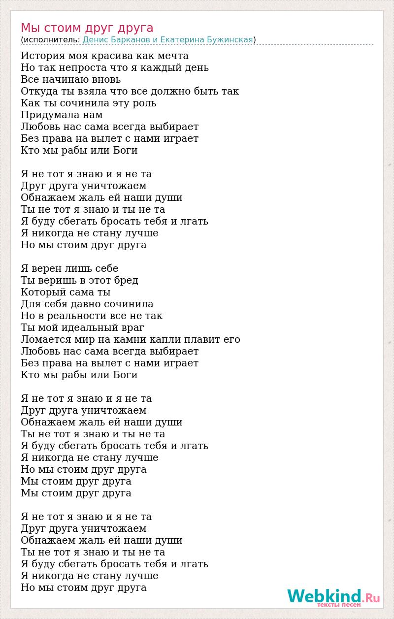 История моя красива как мечта Но так непроста что я каждый день Все начинаю вновь Откуда ты взяла что все должно быть так Как ты сочинила эту роль Придумала нам Любовь нас сама всегда выбирает Без права на вылет с нами играет Кто мы рабы или Боги Я не тот я знаю и я не та Друг друга уничтожаем Обнажаем жаль ей наши души Ты не тот я знаю и ты не та Я буду сбегать бросать тебя и лгать Я никогда не стану лучше Но мы стоим друг друга Я верен лишь себе Ты веришь в этот бред Который сама ты Для себя давно сочинила Но в реальности все не так Ты мой идеальный враг Ломается мир на камни капли плавит его Любовь нас сама всегда выбирает Без права на вылет с нами играет Кто мы рабы или Боги Я не тот я знаю и я не та Друг друга уничтожаем Обнажаем жаль ей наши души Ты не тот я знаю и ты не та Я буду сбегать бросать тебя и лгать Я никогда не стану лучше Но мы стоим друг друга Мы стоим друг друга Мы стоим друг друга Я не тот я знаю и я не та Друг друга уничтожаем Обнажаем жаль ей наши души Ты не тот я знаю и ты не та Я буду сбегать бросать тебя и лгать Я никогда не стану лучше Но мы стоим друг друга