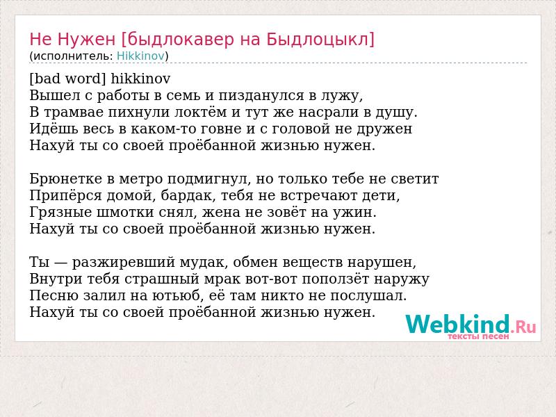 [bad word] hikkinov Вышел с работы в семь и пизданулся в лужу, В трамвае пихнули локтём и тут же насрали в душу. Идёшь весь в каком-то говне и с головой не дружен Нахуй ты со своей проёбанной жизнью нужен. Брюнетке в метро подмигнул, но только тебе не светит Припёрся домой, бардак, тебя не встречают дети, Грязные шмотки снял, жена не зовёт на ужин. Нахуй ты со своей проёбанной жизнью нужен. Ты — разжиревший мудак, обмен веществ нарушен, Внутри тебя страшный мрак вот-вот поползёт наружу Песню залил на ютьюб, её там никто не послушал. Нахуй ты со своей проёбанной жизнью нужен.