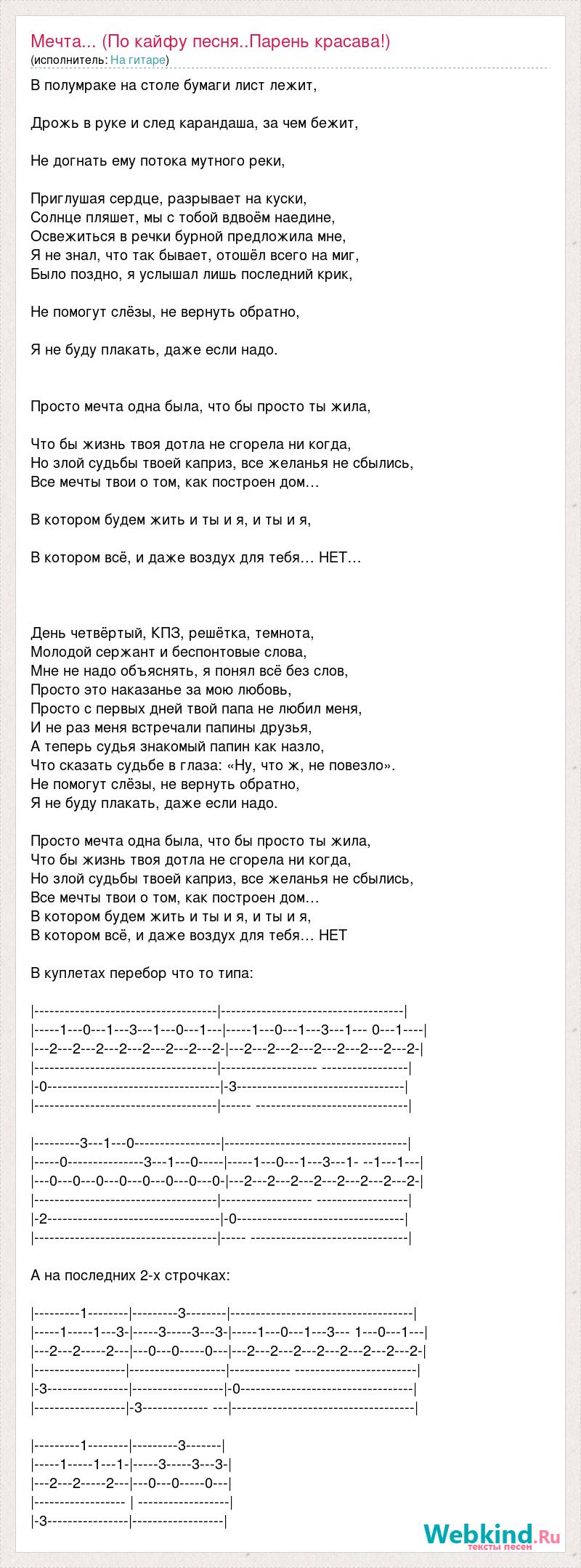 В полумраке на столе бумаги лист лежит, Дрожь в руке и след карандаша, за чем бежит, Не догнать ему потока мутного реки, Приглушая сердце, разрывает на куски, Солнце пляшет, мы с тобой вдвоём наедине, Освежиться в речки бурной предложила мне, Я не знал, что так бывает, отошёл всего на миг, Было поздно, я услышал лишь последний крик, Не помогут слёзы, не вернуть обратно, Я не буду плакать, даже если надо. Просто мечта одна была, что бы просто ты жила, Что бы жизнь твоя дотла не сгорела ни когда, Но злой судьбы твоей каприз, все желанья не сбылись, Все мечты твои о том, как построен дом… В котором будем жить и ты и я, и ты и я, В котором всё, и даже воздух для тебя… НЕТ… День четвёртый, КПЗ, решётка, темнота, Молодой сержант и беспонтовые слова, Мне не надо объяснять, я понял всё без слов, Просто это наказанье за мою любовь, Просто с первых дней твой папа не любил меня, И не раз меня встречали папины друзья, А теперь судья знакомый папин как назло, Что сказать судьбе в глаза: «Ну, что ж, не повезло». Не помогут слёзы, не вернуть обратно, Я не буду плакать, даже если надо. Просто мечта одна была, что бы просто ты жила, Что бы жизнь твоя дотла не сгорела ни когда, Но злой судьбы твоей каприз, все желанья не сбылись, Все мечты твои о том, как построен дом… В котором будем жить и ты и я, и ты и я, В котором всё, и даже воздух для тебя… НЕТ В куплетах перебор что то типа: |------------------------------------|------------------------------------| |-----1---0---1---3---1---0---1---|-----1---0---1---3---1--- 0---1----| |---2---2---2---2---2---2---2---2-|---2---2---2---2---2---2---2---2-| |------------------------------------|------------------- -----------------| |-0----------------------------------|-3---------------------------------| |------------------------------------|------ ------------------------------| |---------3---1---0-----------------|------------------------------------| |-----0---------------3---1---0-----|-----1---0---1---3---1- --1---1---| |---0---0---0---0---0---0---0---0-|---2---2---2---2---2---2---2---2-| |------------------------------------|------------------ ------------------| |-2----------------------------------|-0---------------------------------| |------------------------------------|----- -------------------------------| А на последних 2-х строчках: |---------1--------|---------3--------|------------------------------------| |-----1-----1---3-|-----3-----3---3-|-----1---0---1---3--- 1---0---1---| |---2---2-----2---|---0---0-----0---|---2---2---2---2---2---2---2---2-| |------------------|-------------------|------------ ------------------------| |-3----------------|------------------|-0----------------------------------| |------------------|-3------------- ---|------------------------------------| |---------1--------|---------3-------| |-----1-----1---1-|-----3-----3---3-| |---2---2-----2---|---0---0-----0---| |------------------ | ------------------| |-3----------------|------------------|