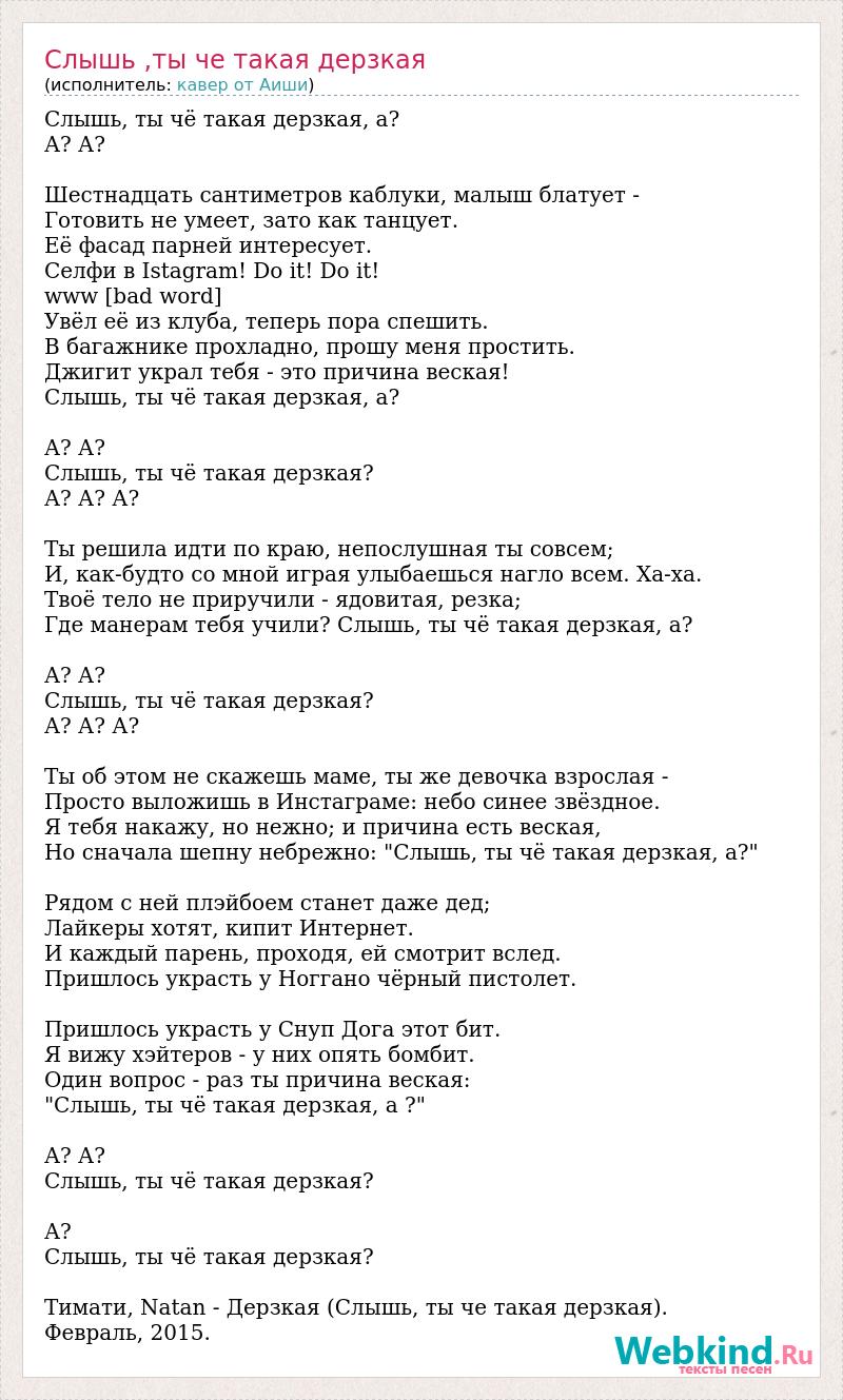 Слышь, ты чё такая дерзкая, а? А? А? Шестнадцать сантиметров каблуки, малыш блатует - Готовить не умеет, зато как танцует. Её фасад парней интересует. Селфи в Istagram! Do it! Do it! www [bad word] Увёл её из клуба, теперь пора спешить. В багажнике прохладно, прошу меня простить. Джигит украл тебя - это причина веская! Слышь, ты чё такая дерзкая, а? А? А? Слышь, ты чё такая дерзкая? А? А? А? Ты решила идти по краю, непослушная ты совсем; И, как-будто со мной играя улыбаешься нагло всем. Ха-ха. Твоё тело не приручили - ядовитая, резка; Где манерам тебя учили? Слышь, ты чё такая дерзкая, а? А? А? Слышь, ты чё такая дерзкая? А? А? А? Ты об этом не скажешь маме, ты же девочка взрослая - Просто выложишь в Инстаграме: небо синее звёздное. Я тебя накажу, но нежно; и причина есть веская, Но сначала шепну небрежно: "Слышь, ты чё такая дерзкая, а?" Рядом с ней плэйбоем станет даже дед; Лайкеры хотят, кипит Интернет. И каждый парень, проходя, ей смотрит вслед. Пришлось украсть у Ноггано чёрный пистолет. Пришлось украсть у Снуп Дога этот бит. Я вижу хэйтеров - у них опять бомбит. Один вопрос - раз ты причина веская: "Слышь, ты чё такая дерзкая, а ?" А? А? Слышь, ты чё такая дерзкая? А? Слышь, ты чё такая дерзкая? Тимати, Natan - Дерзкая (Слышь, ты че такая дерзкая). Февраль, 2015.