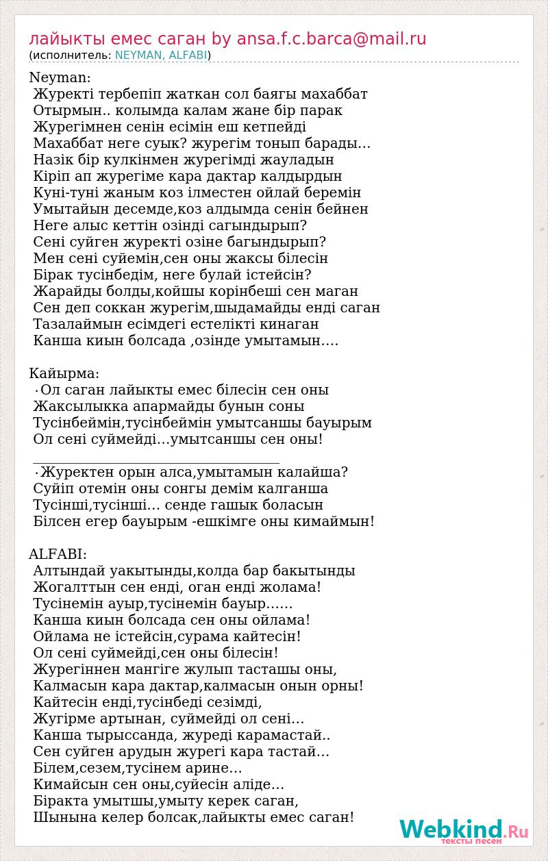 Neyman: Журекті тербепіп жаткан сол баягы махаббат Отырмын.. колымда калам жане бір парак Журегімнен сенін есімін еш кетпейді Махаббат неге суык? журегім тонып барады… Назік бір кулкінмен журегімді жауладын Кіріп ап журегіме кара дактар калдырдын Куні-туні жаным коз ілместен ойлай беремін Умытайын десемде,коз алдымда сенін бейнен Неге алыс кеттін озінді сагындырып? Сені суйген журекті озіне багындырып? Мен сені суйемін,сен оны жаксы білесін Бірак тусінбедім, неге булай істейсін? Жарайды болды,койшы корінбеші сен маган Сен деп соккан журегім,шыдамайды енді саган Тазалаймын есімдегі естелікті кинаган Канша киын болсада ,озінде умытамын…. Кайырма: ۰Ол саган лайыкты емес білесін сен оны Жаксылыкка апармайды бунын соны Тусінбеймін,тусінбеймін умытсаншы бауырым Ол сені суймейді…умытсаншы сен оны! ____________________________________ ۰Журектен орын алса,умытамын калайша? Суйіп отемін оны сонгы демім калганша Тусінші,тусінші… сенде гашык боласын Білсен егер бауырым -ешкімге оны кимаймын! ALFABI: Алтындай уакытынды,колда бар бакытынды Жогалттын сен енді, оган енді жолама! Тусінемін ауыр,тусінемін бауыр…… Канша киын болсада сен оны ойлама! Ойлама не істейсін,сурама кайтесін! Ол сені суймейді,сен оны білесін! Журегіннен мангіге жулып тасташы оны, Калмасын кара дактар,калмасын онын орны! Кайтесін енді,тусінбеді сезімді, Жугірме артынан, суймейді ол сені… Канша тырыссанда, журеді карамастай.. Сен суйген арудын журегі кара тастай… Білем,сезем,тусінем арине… Кимайсын сен оны,суйесін аліде… Біракта умытшы,умыту керек саган, Шынына келер болсак,лайыкты емес саган!