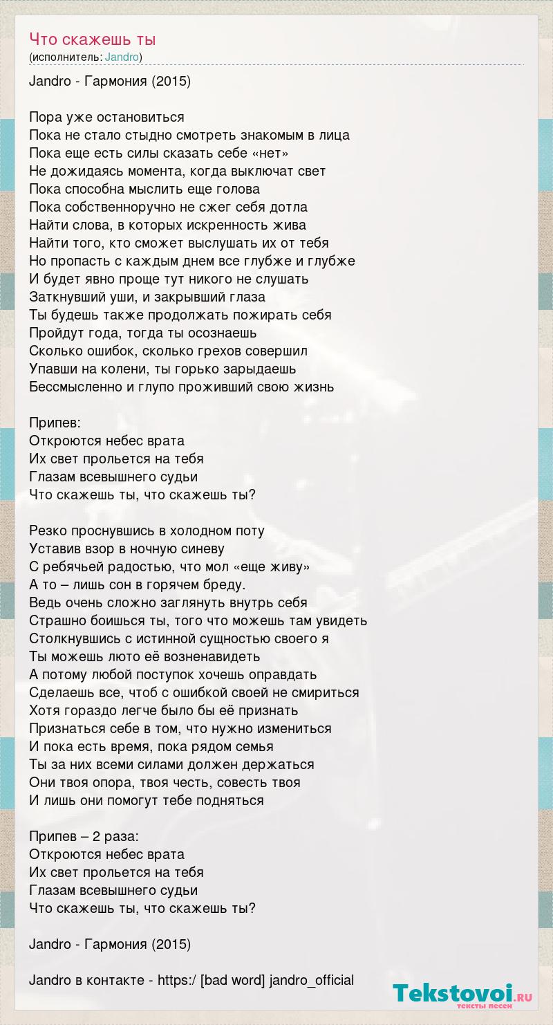 Jandro - Гармония (2015) Пора уже остановиться Пока не стало стыдно смотреть знакомым в лица Пока еще есть силы сказать себе «нет» Не дожидаясь момента, когда выключат свет Пока способна мыслить еще голова Пока собственноручно не сжег себя дотла Найти слова, в которых искренность жива Найти того, кто сможет выслушать их от тебя Но пропасть с каждым днем все глубже и глубже И будет явно проще тут никого не слушать Заткнувший уши, и закрывший глаза Ты будешь также продолжать пожирать себя Пройдут года, тогда ты осознаешь Сколько ошибок, сколько грехов совершил Упавши на колени, ты горько зарыдаешь Бессмысленно и глупо проживший свою жизнь Припев: Откроются небес врата Их свет прольется на тебя Глазам всевышнего судьи Что скажешь ты, что скажешь ты? Резко проснувшись в холодном поту Уставив взор в ночную синеву С ребячьей радостью, что мол «еще живу» А то – лишь сон в горячем бреду. Ведь очень сложно заглянуть внутрь себя Страшно боишься ты, того что можешь там увидеть Столкнувшись с истинной сущностью своего я Ты можешь люто её возненавидеть А потому любой поступок хочешь оправдать Сделаешь все, чтоб с ошибкой своей не смириться Хотя гораздо легче было бы её признать Признаться себе в том, что нужно измениться И пока есть время, пока рядом семья Ты за них всеми силами должен держаться Они твоя опора, твоя честь, совесть твоя И лишь они помогут тебе подняться Припев – 2 раза: Откроются небес врата Их свет прольется на тебя Глазам всевышнего судьи Что скажешь ты, что скажешь ты? Jandro - Гармония (2015) Jandro в контакте - https:/ [bad word] jandro_official