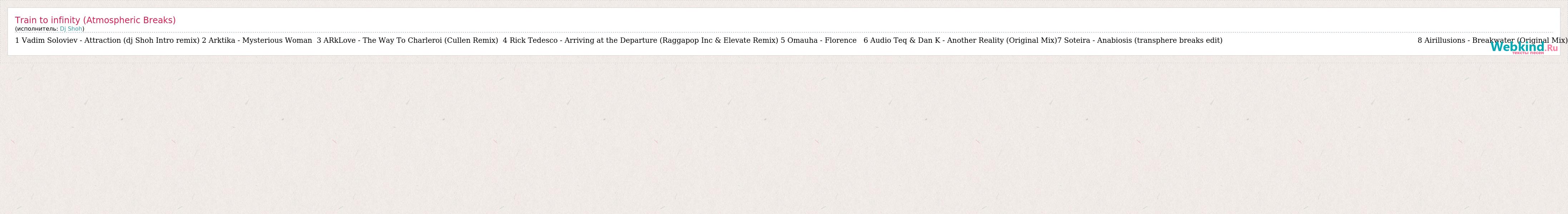 1 Vadim Soloviev - Attraction (dj Shoh Intro remix) 2 Arktika - Mysterious Woman 3 ARkLove - The Way To Charleroi (Cullen Remix) 4 Rick Tedesco - Arriving at the Departure (Raggapop Inc & Elevate Remix) 5 Omauha - Florence 6 Audio Teq & Dan K - Another Reality (Original Mix)7 Soteira - Anabiosis (transphere breaks edit) 8 Airillusions - Breakwater (Original Mix)