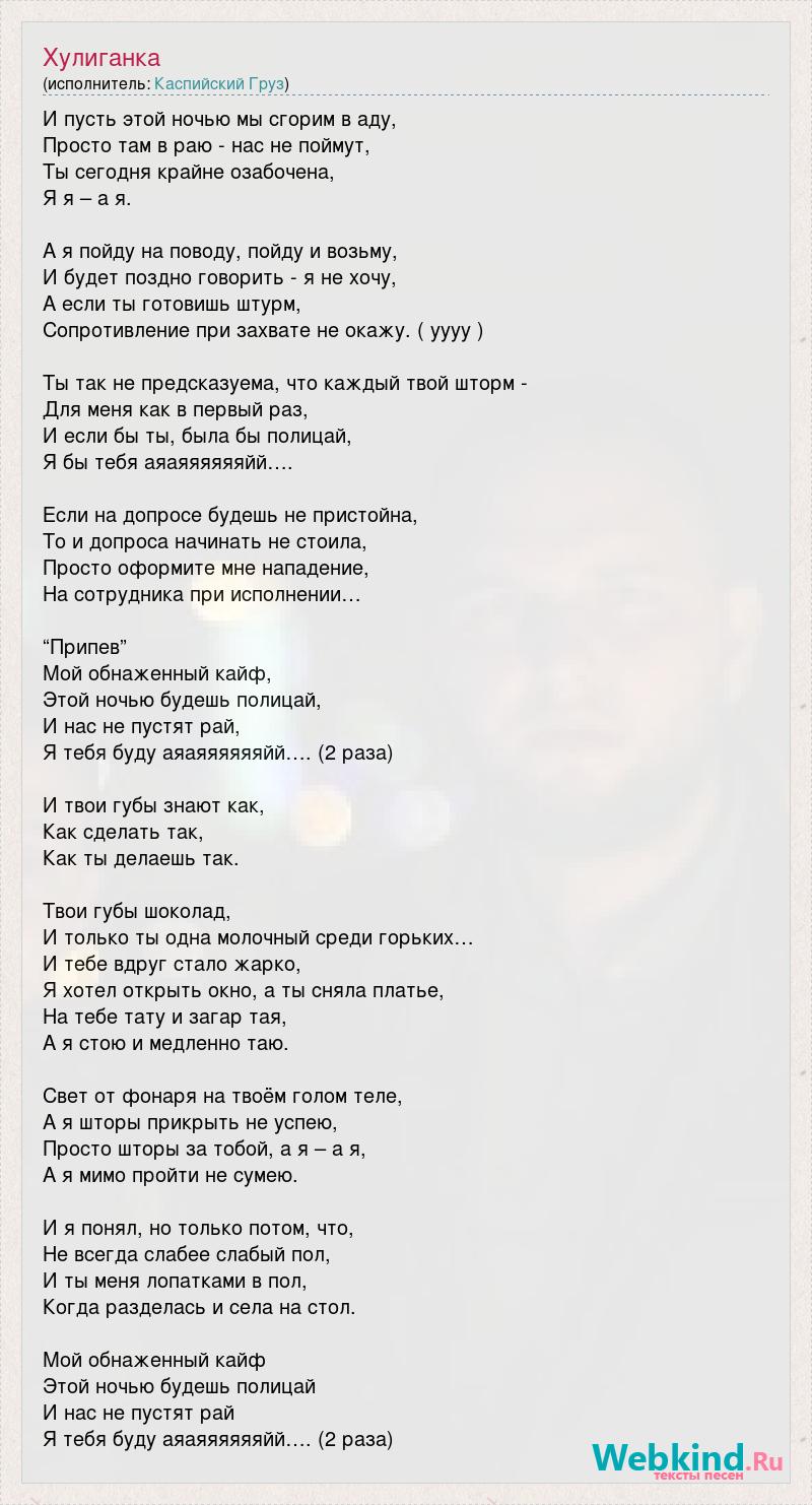 И пусть этой ночью мы сгорим в аду, Просто там в раю - нас не поймут, Ты сегодня крайне озабочена, Я я – а я. А я пойду на поводу, пойду и возьму, И будет поздно говорить - я не хочу, А если ты готовишь штурм, Сопротивление при захвате не окажу. ( уууу ) Ты так не предсказуема, что каждый твой шторм - Для меня как в первый раз, И если бы ты, была бы полицай, Я бы тебя аяаяяяяяяйй…. Если на допросе будешь не пристойна, То и допроса начинать не стоила, Просто оформите мне нападение, На сотрудника при исполнении… “Припев” Мой обнаженный кайф, Этой ночью будешь полицай, И нас не пустят рай, Я тебя буду аяаяяяяяяйй…. (2 раза) И твои губы знают как, Как сделать так, Как ты делаешь так. Твои губы шоколад, И только ты одна молочный среди горьких… И тебе вдруг стало жарко, Я хотел открыть окно, а ты сняла платье, На тебе тату и загар тая, А я стою и медленно таю. Свет от фонаря на твоём голом теле, А я шторы прикрыть не успею, Просто шторы за тобой, а я – а я, А я мимо пройти не сумею. И я понял, но только потом, что, Не всегда слабее слабый пол, И ты меня лопатками в пол, Когда разделась и села на стол. Мой обнаженный кайф Этой ночью будешь полицай И нас не пустят рай Я тебя буду аяаяяяяяяйй…. (2 раза)