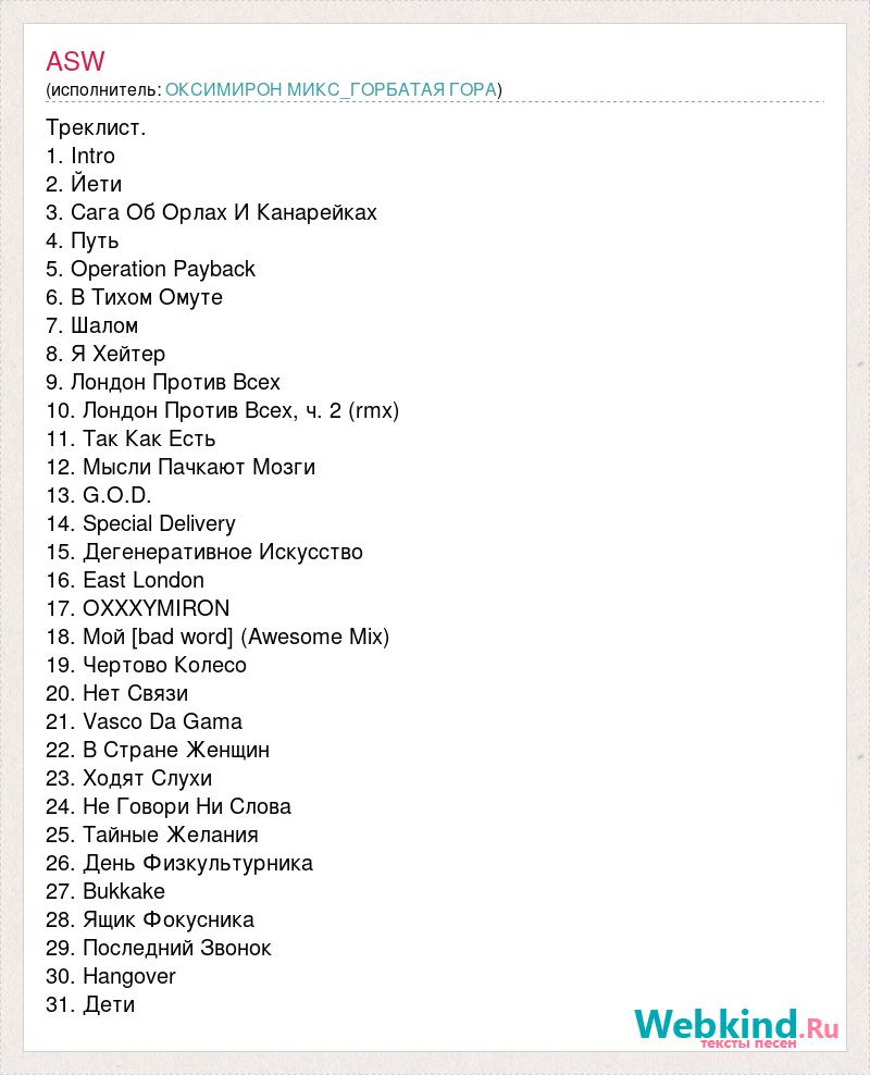 Треклист. 1. Intro 2. Йети 3. Сага Об Орлах И Канарейках 4. Путь 5. Operation Payback 6. В Тихом Омуте 7. Шалом 8. Я Хейтер 9. Лондон Против Всех 10. Лондон Против Всех, ч. 2 (rmx) 11. Так Как Есть 12. Мысли Пачкают Мозги 13. G.O.D. 14. Special Delivery 15. Дегенеративное Искусство 16. East London 17. OXXXYMIRON 18. Мой [bad word] (Awesome Mix) 19. Чертово Колесо 20. Нет Связи 21. Vasco Da Gama 22. В Стране Женщин 23. Ходят Слухи 24. Не Говори Ни Слова 25. Тайные Желания 26. День Физкультурника 27. Bukkake 28. Ящик Фокусника 29. Последний Звонок 30. Hangover 31. Дети