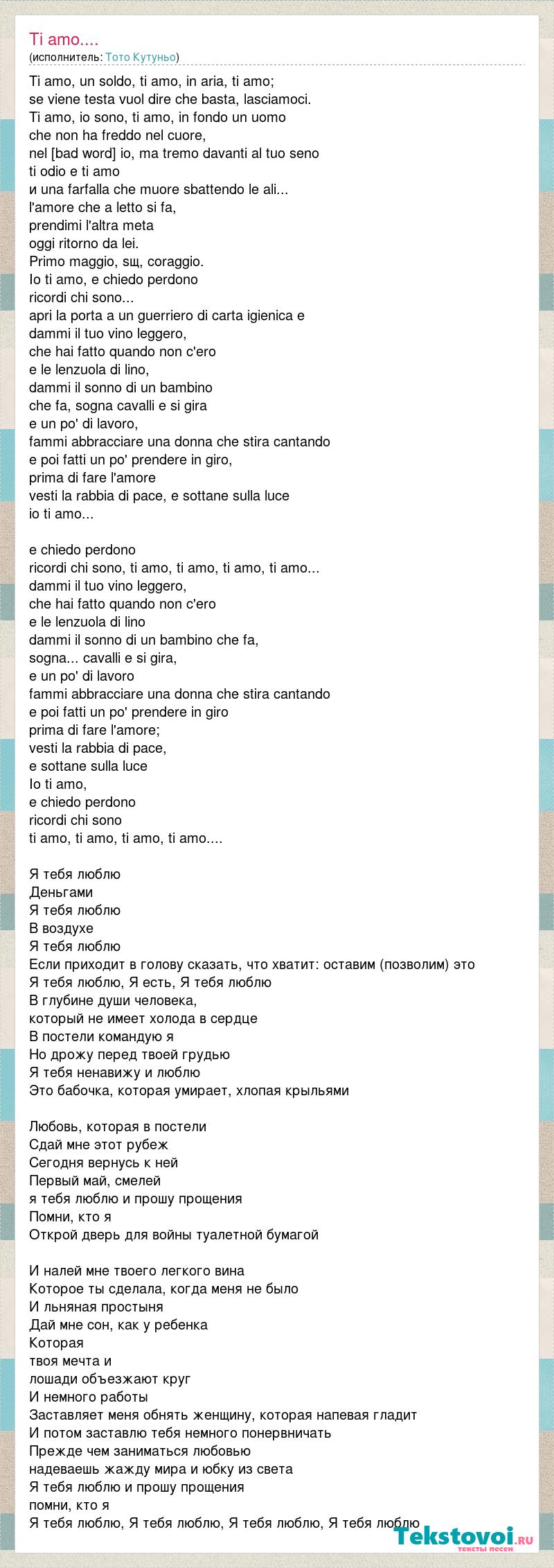 Ti amo, un soldo, ti amo, in aria, ti amo; se viene testa vuol dire che basta, lasciamoci. Ti amo, io sono, ti amo, in fondo un uomo che non ha freddo nel cuore, nel [bad word] io, ma tremo davanti al tuo seno ti odio e ti amo и una farfalla che muore sbattendo le ali... l'amore che a letto si fa, prendimi l'altra metа oggi ritorno da lei. Primo maggio, sщ, coraggio. Io ti amo, e chiedo perdono ricordi chi sono... apri la porta a un guerriero di carta igienica e dammi il tuo vino leggero, che hai fatto quando non c'ero e le lenzuola di lino, dammi il sonno di un bambino che fa, sogna cavalli e si gira e un po' di lavoro, fammi abbracciare una donna che stira cantando e poi fatti un po' prendere in giro, prima di fare l'amore vesti la rabbia di pace, e sottane sulla luce io ti amo... e chiedo perdono ricordi chi sono, ti amo, ti amo, ti amo, ti amo... dammi il tuo vino leggero, che hai fatto quando non c'ero e le lenzuola di lino dammi il sonno di un bambino che fa, sogna... cavalli e si gira, e un po' di lavoro fammi abbracciare una donna che stira cantando e poi fatti un po' prendere in giro prima di fare l'amore; vesti la rabbia di pace, e sottane sulla luce Io ti amo, e chiedo perdono ricordi chi sono ti amo, ti amo, ti amo, ti amo.... Я тебя люблю Деньгами Я тебя люблю В воздухе Я тебя люблю Если приходит в голову сказать, что хватит: оставим (позволим) это Я тебя люблю, Я есть, Я тебя люблю В глубине души человека, который не имеет холода в сердце В постели командую я Но дрожу перед твоей грудью Я тебя ненавижу и люблю Это бабочка, которая умирает, хлопая крыльями Любовь, которая в постели Сдай мне этот рубеж Сегодня вернусь к ней Первый май, смелей я тебя люблю и прошу прощения Помни, кто я Открой дверь для войны туалетной бумагой И налей мне твоего легкого вина Которое ты сделала, когда меня не было И льняная простыня Дай мне сон, как у ребенка Которая твоя мечта и лошади объезжают круг И немного работы Заставляет меня обнять женщину, которая напевая гладит И потом заставлю тебя немного понервничать Прежде чем заниматься любовью надеваешь жажду мира и юбку из света Я тебя люблю и прошу прощения помни, кто я Я тебя люблю, Я тебя люблю, Я тебя люблю, Я тебя люблю