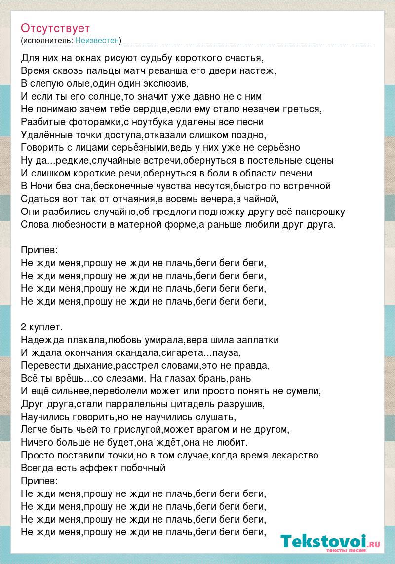 Для них на окнах рисуют судьбу короткого счастья, Время сквозь пальцы матч реванша его двери настеж, В слепую олые,один один экслюзив, И если ты его солнце,то значит уже давно не с ним Не понимаю зачем тебе сердце,если ему стало незачем греться, Разбитые фоторамки,с ноутбука удалены все песни Удалённые точки доступа,отказали слишком поздно, Говорить с лицами серьёзными,ведь у них уже не серьёзно Ну да...редкие,случайные встречи,обернуться в постельные сцены И слишком короткие речи,обернуться в боли в области печени В Ночи без сна,бесконечные чувства несутся,быстро по встречной Сдаться вот так от отчаяния,в восемь вечера,в чайной, Они разбились случайно,об предлоги подножку другу всё панорошку Слова любезности в матерной форме,а раньше любили друг друга. Припев: Не жди меня,прошу не жди не плачь,беги беги беги, Не жди меня,прошу не жди не плачь,беги беги беги, Не жди меня,прошу не жди не плачь,беги беги беги, Не жди меня,прошу не жди не плачь,беги беги беги, 2 куплет. Надежда плакала,любовь умирала,вера шила заплатки И ждала окончания скандала,сигарета...пауза, Перевести дыхание,расстрел словами,это не правда, Всё ты врёшь...со слезами. На глазах брань,рань И ещё сильнее,переболели может или просто понять не сумели, Друг друга,стали парралельны цитадель разрушив, Научились говорить,но не научились слушать, Легче быть чьей то прислугой,может врагом и не другом, Ничего больше не будет,она ждёт,она не любит. Просто поставили точки,но в том случае,когда время лекарство Всегда есть эффект побочный Припев: Не жди меня,прошу не жди не плачь,беги беги беги, Не жди меня,прошу не жди не плачь,беги беги беги, Не жди меня,прошу не жди не плачь,беги беги беги, Не жди меня,прошу не жди не плачь,беги беги беги,