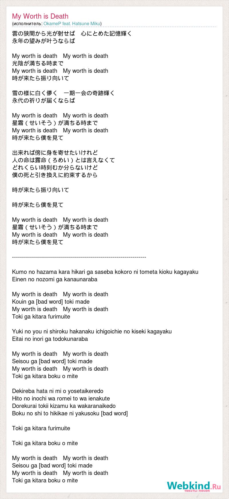 雲の狭間から光が射せば 心にとめた記憶輝く 永年の望みが叶うならば My worth is death My worth is death 光陰が満ちる時まで My worth is death My worth is death 時が来たら振り向いて 雪の様に白く儚く 一期一会の奇跡輝く 永代の祈りが届くならば My worth is death My worth is death 星霜(せいそう)が満ちる時まで My worth is death My worth is death 時が来たら僕を見て 出来れば傍に身を寄せたいけれど 人の命は露命(ろめい)とは言えなくて どれくらい時刻むか分らないけど 僕の死と引き換えに約束するから 時が来たら振り向いて 時が来たら僕を見て My worth is death My worth is death 星霜(せいそう)が満ちる時まで My worth is death My worth is death 時が来たら僕を見て ------------------------------------------------------------------- Kumo no hazama kara hikari ga saseba kokoro ni tometa kioku kagayaku Einen no nozomi ga kanaunaraba My worth is death My worth is death Kouin ga [bad word] toki made My worth is death My worth is death Toki ga kitara furimuite Yuki no you ni shiroku hakanaku ichigoichie no kiseki kagayaku Eitai no inori ga todokunaraba My worth is death My worth is death Seisou ga [bad word] toki made My worth is death My worth is death Toki ga kitara boku o mite Dekireba hata ni mi o yosetaikeredo Hito no inochi wa romei to wa ienakute Dorekurai tokii kizamu ka wakaranaikedo Boku no shi to hikikae ni yakusoku [bad word] Toki ga kitara furimuite Toki ga kitara boku o mite My worth is death My worth is death Seisou ga [bad word] toki made My worth is death My worth is death Toki ga kitara boku o mite