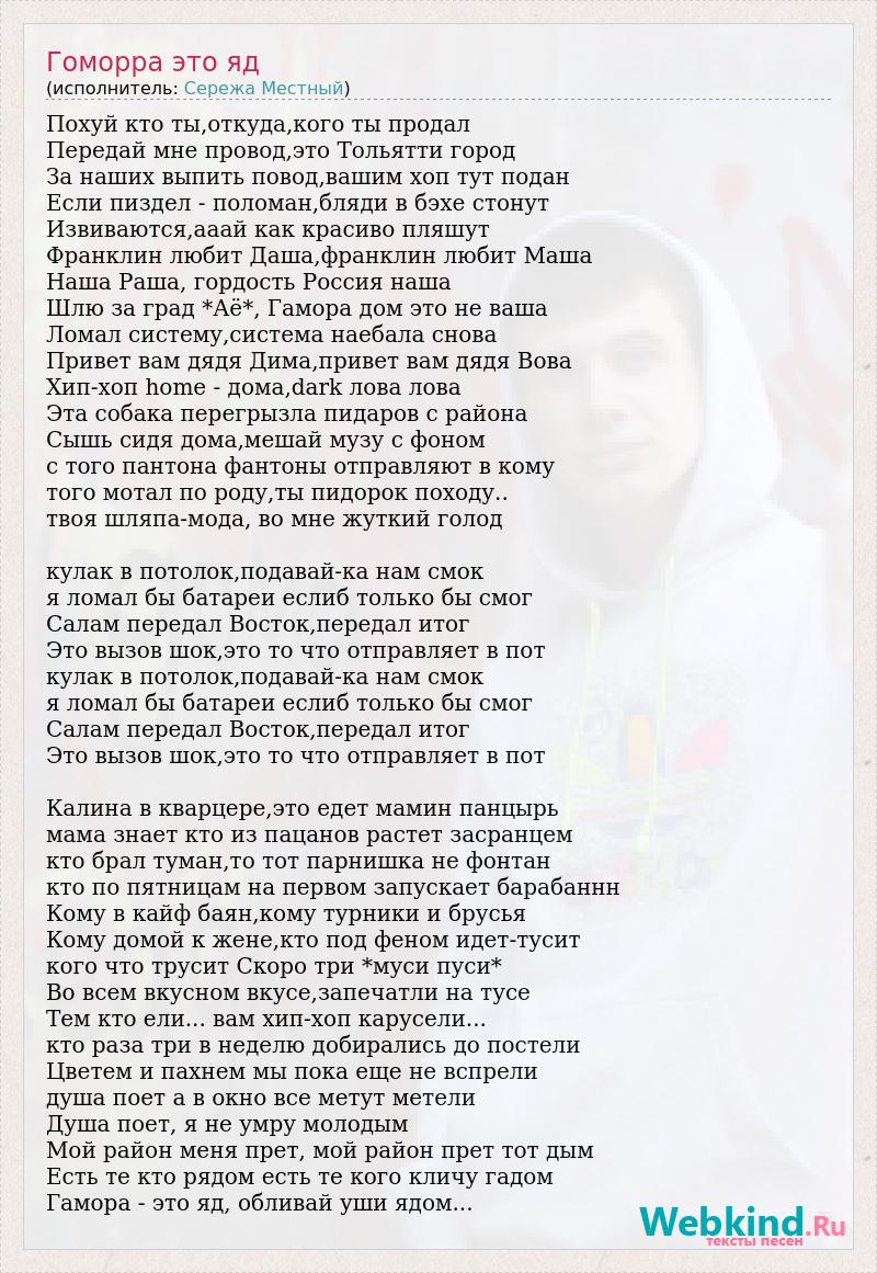 Похуй кто ты,откуда,кого ты продал Передай мне провод,это Тольятти город За наших выпить повод,вашим хоп тут подан Если пиздел - поломан,бляди в бэхе стонут Извиваются,ааай как красиво пляшут Франклин любит Даша,франклин любит Маша Наша Раша, гордость Россия наша Шлю за град *Аё*, Гамора дом это не ваша Ломал систему,система наебала снова Привет вам дядя Дима,привет вам дядя Вова Хип-хоп homе - дома,dark лова лова Эта собака перегрызла пидаров с района Сышь сидя дома,мешай музу с фоном с того пантона фантоны отправляют в кому того мотал по роду,ты пидорок походу.. твоя шляпа-мода, во мне жуткий голод кулак в потолок,подавай-ка нам смок я ломал бы батареи еслиб только бы смог Салам передал Восток,передал итог Это вызов шок,это то что отправляет в пот кулак в потолок,подавай-ка нам смок я ломал бы батареи еслиб только бы смог Салам передал Восток,передал итог Это вызов шок,это то что отправляет в пот Калина в кварцере,это едет мамин панцырь мама знает кто из пацанов растет засранцем кто брал туман,то тот парнишка не фонтан кто по пятницам на первом запускает барабаннн Кому в кайф баян,кому турники и брусья Кому домой к жене,кто под феном идет-тусит кого что трусит Скоро три *муси пуси* Во всем вкусном вкусе,запечатли на тусе Тем кто ели... вам хип-хоп карусели... кто раза три в неделю добирались до постели Цветем и пахнем мы пока еще не вспрели душа поет а в окно все метут метели Душа поет, я не умру молодым Мой район меня прет, мой район прет тот дым Есть те кто рядом есть те кого кличу гадом Гамора - это яд, обливай уши ядом...