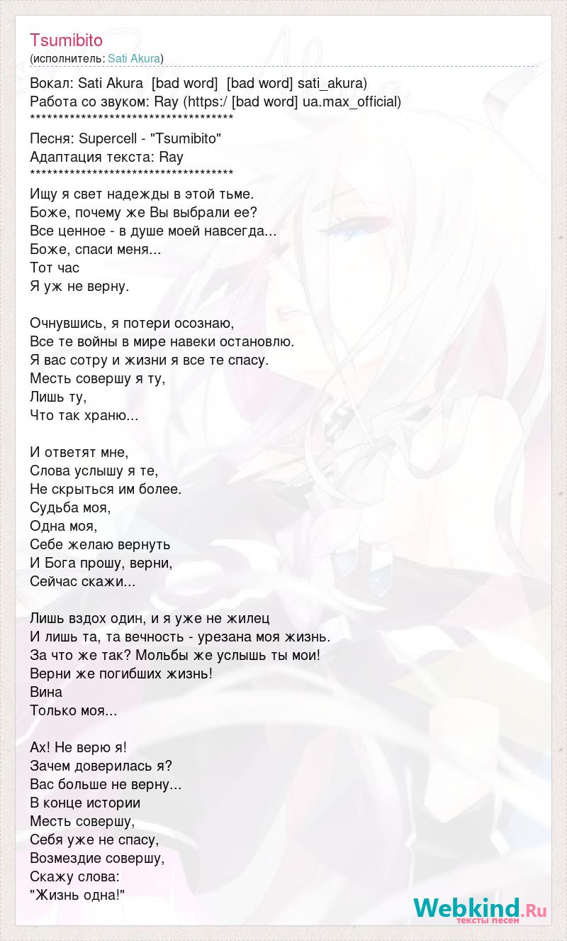 Вокал: Sati Akura [bad word] [bad word] sati_akura) Работа со звуком: Ray (https:/ [bad word] ua.max_official) ************************************ Песня: Supercell - "Tsumibito" Адаптация текста: Ray ************************************ Ищу я свет надежды в этой тьме. Боже, почему же Вы выбрали ее? Все ценное - в душе моей навсегда... Боже, спаси меня... Тот час Я уж не верну. Очнувшись, я потери осознаю, Все те войны в мире навеки остановлю. Я вас сотру и жизни я все те спасу. Месть совершу я ту, Лишь ту, Что так храню... И ответят мне, Слова услышу я те, Не скрыться им более. Судьба моя, Одна моя, Себе желаю вернуть И Бога прошу, верни, Сейчас скажи... Лишь вздох один, и я уже не жилец И лишь та, та вечность - урезана моя жизнь. За что же так? Мольбы же услышь ты мои! Верни же погибших жизнь! Вина Только моя... Ах! Не верю я! Зачем доверилась я? Вас больше не верну... В конце истории Месть совершу, Себя уже не спасу, Возмездие совершу, Скажу слова: "Жизнь одна!"