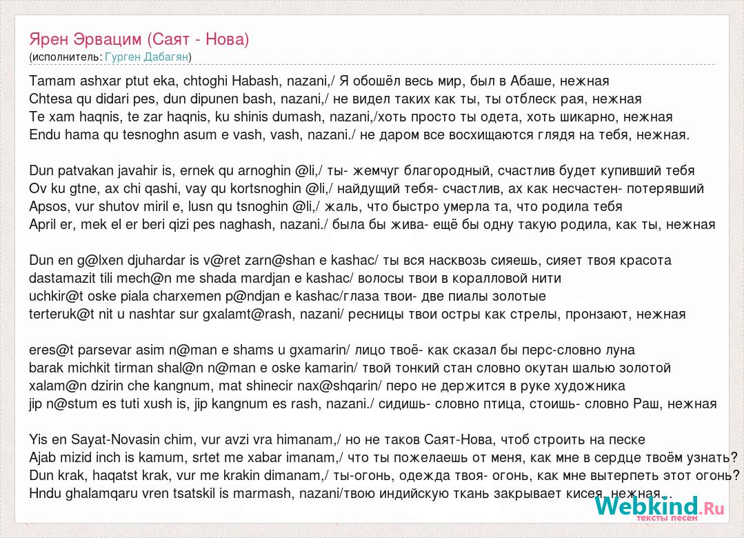 Tamam ashxar ptut eka, chtoghi Habash, nazani,/ Я обошёл весь мир, был в Абаше, нежная Chtesa qu didari pes, dun dipunen bash, nazani,/ не видел таких как ты, ты отблеск рая, нежная Te xam haqnis, te zar haqnis, ku shinis dumash, nazani,/хоть просто ты одета, хоть шикарно, нежная Endu hama qu tesnoghn asum e vash, vash, nazani./ не даром все восхищаются глядя на тебя, нежная. Dun patvakan javahir is, ernek qu arnoghin @li,/ ты- жемчуг благородный, счастлив будет купивший тебя Ov ku gtne, ax chi qashi, vay qu kortsnoghin @li,/ найдущий тебя- счастлив, ах как несчастен- потерявший Apsos, vur shutov miril e, lusn qu tsnoghin @li,/ жаль, что быстро умерла та, что родила тебя April er, mek el er beri qizi pes naghash, nazani./ была бы жива- ещё бы одну такую родила, как ты, нежная Dun en g@lxen djuhardar is v@ret zarn@shan e kashac/ ты вся насквозь сияешь, сияет твоя красота dastamazit tili mech@n me shada mardjan e kashac/ волосы твои в коралловой нити uchkir@t oske piala charxemen p@ndjan e kashac/глаза твои- две пиалы золотые terteruk@t nit u nashtar sur gxalamt@rash, nazani/ ресницы твои остры как стрелы, пронзают, нежная eres@t parsevar asim n@man e shams u gxamarin/ лицо твоё- как сказал бы перс-словно луна barak michkit tirman shal@n n@man e oske kamarin/ твой тонкий стан словно окутан шалью золотой xalam@n dzirin che kangnum, mat shinecir nax@shqarin/ перо не держится в руке художника jip n@stum es tuti xush is, jip kangnum es rash, nazani./ сидишь- словно птица, стоишь- словно Раш, нежная Yis en Sayat-Novasin chim, vur avzi vra himanam,/ но не таков Саят-Нова, чтоб строить на песке Ajab mizid inch is kamum, srtet me xabar imanam,/ что ты пожелаешь от меня, как мне в сердце твоём узнать? Dun krak, haqatst krak, vur me krakin dimanam,/ ты-огонь, одежда твоя- огонь, как мне вытерпеть этот огонь? Hndu ghalamqaru vren tsatskil is marmash, nazani/твою индийскую ткань закрывает кисея, нежная...