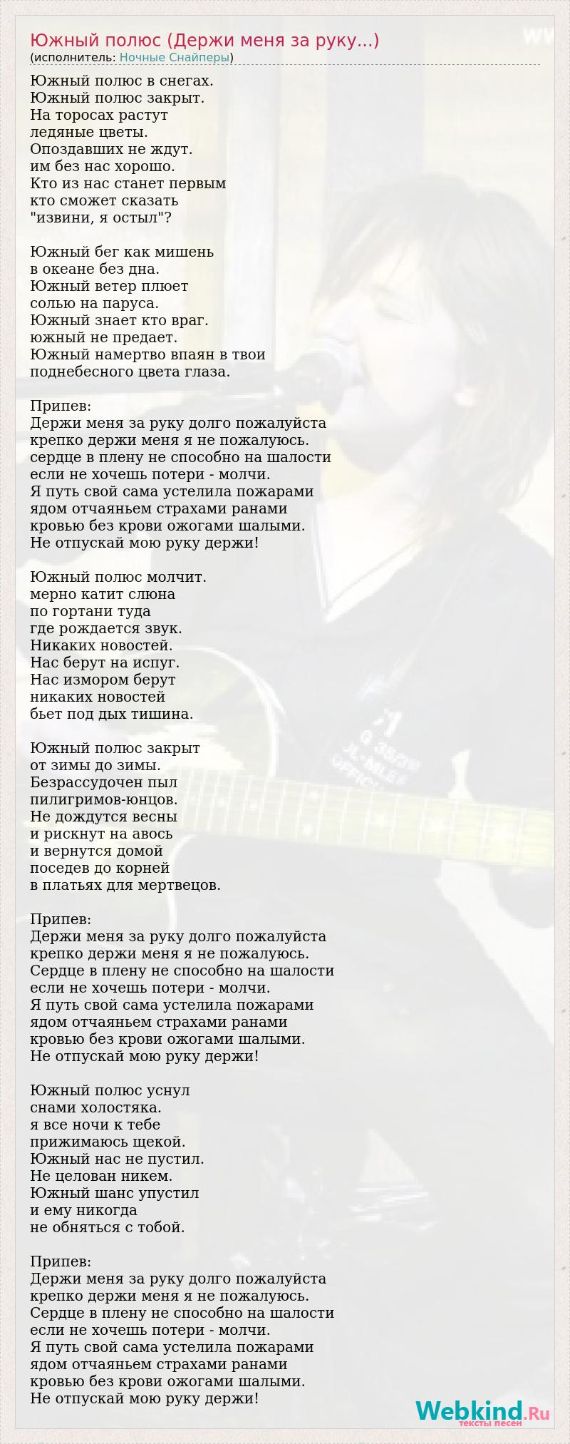 Южный полюс в снегах. Южный полюс закрыт. На торосах растут ледяные цветы. Опоздавших не ждут. им без нас хорошо. Кто из нас станет первым кто сможет сказать "извини, я остыл"? Южный бег как мишень в океане без дна. Южный ветер плюет солью на паруса. Южный знает кто враг. южный не предает. Южный намертво впаян в твои поднебесного цвета глаза. Припев: Держи меня за руку долго пожалуйста крепко держи меня я не пожалуюсь. сердце в плену не способно на шалости если не хочешь потери - молчи. Я путь свой сама устелила пожарами ядом отчаяньем страхами ранами кровью без крови ожогами шалыми. Не отпускай мою руку держи! Южный полюс молчит. мерно катит слюна по гортани туда где рождается звук. Никаких новостей. Нас берут на испуг. Нас измором берут никаких новостей бьет под дых тишина. Южный полюс закрыт от зимы до зимы. Безрассудочен пыл пилигримов-юнцов. Не дождутся весны и рискнут на авось и вернутся домой поседев до корней в платьях для мертвецов. Припев: Держи меня за руку долго пожалуйста крепко держи меня я не пожалуюсь. Сердце в плену не способно на шалости если не хочешь потери - молчи. Я путь свой сама устелила пожарами ядом отчаяньем страхами ранами кровью без крови ожогами шалыми. Не отпускай мою руку держи! Южный полюс уснул снами холостяка. я все ночи к тебе прижимаюсь щекой. Южный нас не пустил. Не целован никем. Южный шанс упустил и ему никогда не обняться с тобой. Припев: Держи меня за руку долго пожалуйста крепко держи меня я не пожалуюсь. Сердце в плену не способно на шалости если не хочешь потери - молчи. Я путь свой сама устелила пожарами ядом отчаяньем страхами ранами кровью без крови ожогами шалыми. Не отпускай мою руку держи!