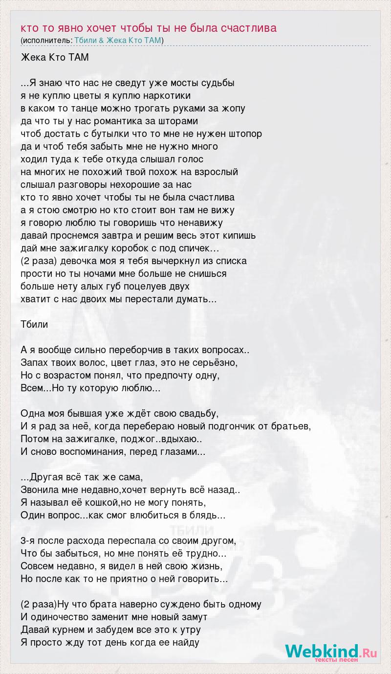 Жека Кто ТАМ ...Я знаю что нас не сведут уже мосты судьбы я не куплю цветы я куплю наркотики в каком то танце можно трогать руками за жопу да что ты у нас романтика за шторами чтоб достать с бутылки что то мне не нужен штопор да и чтоб тебя забыть мне не нужно много ходил туда к тебе откуда слышал голос на многих не похожий твой похож на взрослый слышал разговоры нехорошие за нас кто то явно хочет чтобы ты не была счастлива а я стою смотрю но кто стоит вон там не вижу я говорю люблю ты говоришь что ненавижу давай проснемся завтра и решим весь этот кипишь дай мне зажигалку коробок с под спичек… (2 раза) девочка моя я тебя вычеркнул из списка прости но ты ночами мне больше не снишься больше нету алых губ поцелуев двух хватит с нас двоих мы перестали думать... Тбили А я вообще сильно переборчив в таких вопросах.. Запах твоих волос, цвет глаз, это не серьёзно, Но с возрастом понял, что предпочту одну, Всем...Но ту которую люблю... Одна моя бывшая уже ждёт свою свадьбу, И я рад за неё, когда перебераю новый подгончик от братьев, Потом на зажигалке, поджог..вдыхаю.. И сново воспоминания, перед глазами... ...Другая всё так же сама, Звонила мне недавно,хочет вернуть всё назад.. Я называл её кошкой,но не могу понять, Один вопрос...как смог влюбиться в блядь... 3-я после расхода переспала со своим другом, Что бы забыться, но мне понять её трудно... Совсем недавно, я видел в ней свою жизнь, Но после как то не приятно о ней говорить... (2 раза)Ну что брата наверно суждено быть одному И одиночество заменит мне новый замут Давай курнем и забудем все это к утру Я просто жду тот день когда ее найду