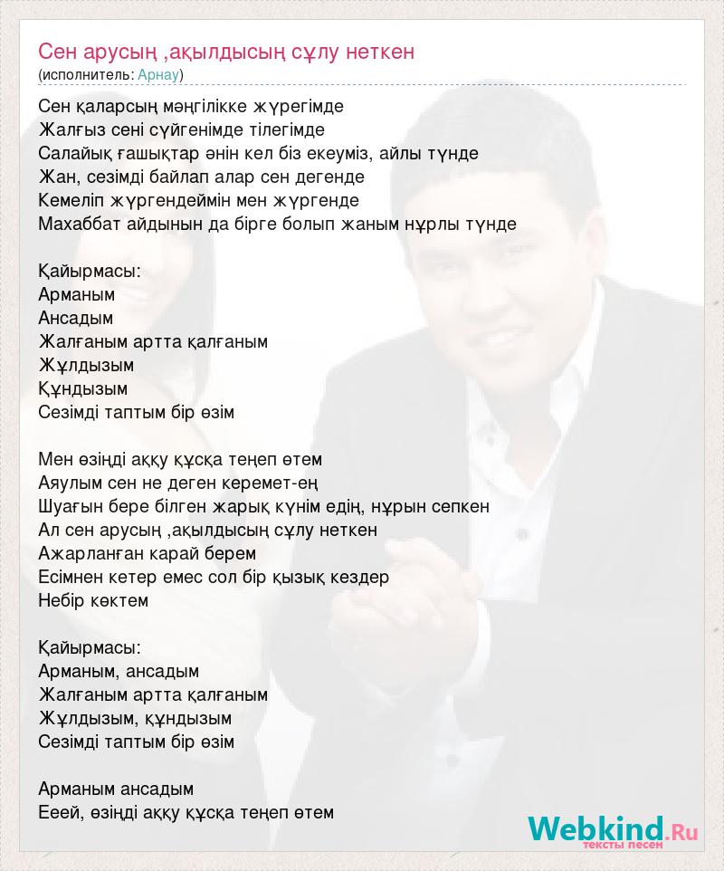 Cен қаларсың мәңгілікке жүрегімде Жалғыз сені сүйгенімде тілегімде Салайық ғашықтар әнін кел біз екеуміз, айлы түнде Жан, сезімді байлап алар сен дегенде Кемеліп жүргендеймін мен жүргенде Махаббат айдынын да бірге болып жаным нұрлы түнде Қайырмасы: Арманым Ансадым Жалғаным артта қалғаным Жұлдызым Құндызым Сезімді таптым бір өзім Мен өзіңді аққу құсқа теңеп өтем Аяулым сен не деген керемет-ең Шуағын бере білген жарық күнім едің, нұрын сепкен Ал сен арусың ,ақылдысың сұлу неткен Ажарланған карай берем Есімнен кетер емес сол бір қызық кездер Небір көктем Қайырмасы: Арманым, ансадым Жалғаным артта қалғаным Жұлдызым, құндызым Сезімді таптым бір өзім Арманым ансадым Ееей, өзіңді аққу құсқа теңеп өтем