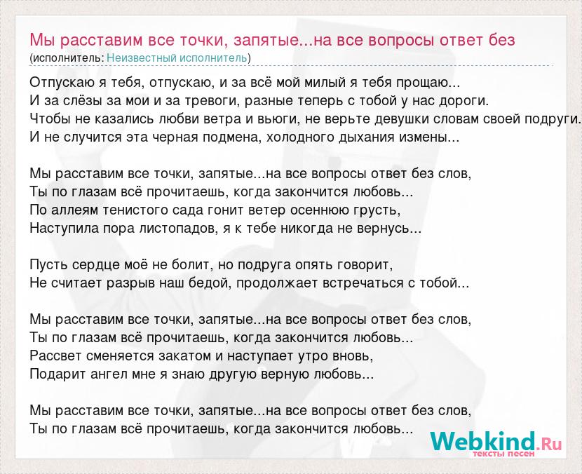 Отпускаю я тебя, отпускаю, и за всё мой милый я тебя прощаю... И за слёзы за мои и за тревоги, разные теперь с тобой у нас дороги. Чтобы не казались любви ветра и вьюги, не верьте девушки словам своей подруги. И не случится эта черная подмена, холодного дыхания измены... Мы расставим все точки, запятые...на все вопросы ответ без слов, Ты по глазам всё прочитаешь, когда закончится любовь... По аллеям тенистого сада гонит ветер осеннюю грусть, Наступила пора листопадов, я к тебе никогда не вернусь... Пусть сердце моё не болит, но подруга опять говорит, Не считает разрыв наш бедой, продолжает встречаться с тобой... Мы расставим все точки, запятые...на все вопросы ответ без слов, Ты по глазам всё прочитаешь, когда закончится любовь... Рассвет сменяется закатом и наступает утро вновь, Подарит ангел мне я знаю другую верную любовь... Мы расставим все точки, запятые...на все вопросы ответ без слов, Ты по глазам всё прочитаешь, когда закончится любовь...