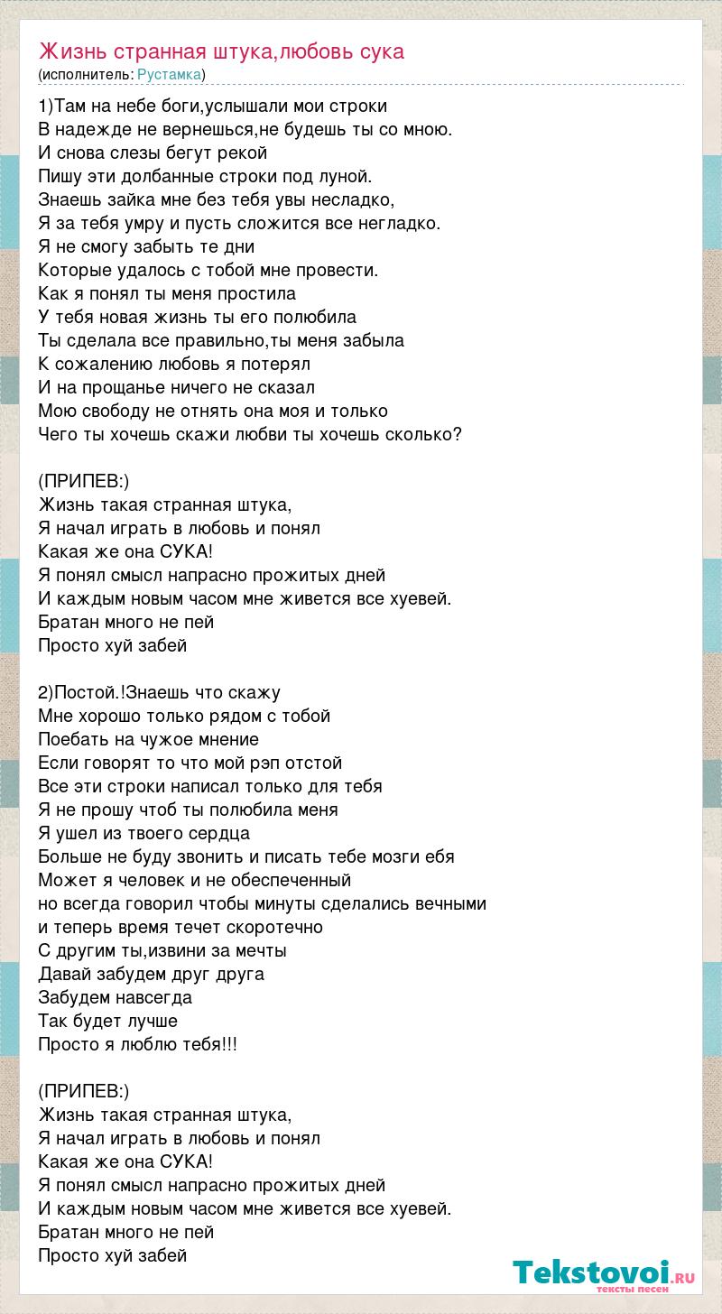 1)Там на небе боги,услышали мои строки В надежде не вернешься,не будешь ты со мною. И снова слезы бегут рекой Пишу эти долбанные строки под луной. Знаешь зайка мне без тебя увы несладко, Я за тебя умру и пусть сложится все негладко. Я не смогу забыть те дни Которые удалось с тобой мне провести. Как я понял ты меня простила У тебя новая жизнь ты его полюбила Ты сделала все правильно,ты меня забыла К сожалению любовь я потерял И на прощанье ничего не сказал Мою свободу не отнять она моя и только Чего ты хочешь скажи любви ты хочешь сколько? (ПРИПЕВ:) Жизнь такая странная штука, Я начал играть в любовь и понял Какая же она СУКА! Я понял смысл напрасно прожитых дней И каждым новым часом мне живется все хуевей. Братан много не пей Просто хуй забей 2)Постой.!Знаешь что скажу Мне хорошо только рядом с тобой Поебать на чужое мнение Если говорят то что мой рэп отстой Все эти строки написал только для тебя Я не прошу чтоб ты полюбила меня Я ушел из твоего сердца Больше не буду звонить и писать тебе мозги ебя Может я человек и не обеспеченный но всегда говорил чтобы минуты сделались вечными и теперь время течет скоротечно С другим ты,извини за мечты Давай забудем друг друга Забудем навсегда Так будет лучше Просто я люблю тебя!!! (ПРИПЕВ:) Жизнь такая странная штука, Я начал играть в любовь и понял Какая же она СУКА! Я понял смысл напрасно прожитых дней И каждым новым часом мне живется все хуевей. Братан много не пей Просто хуй забей