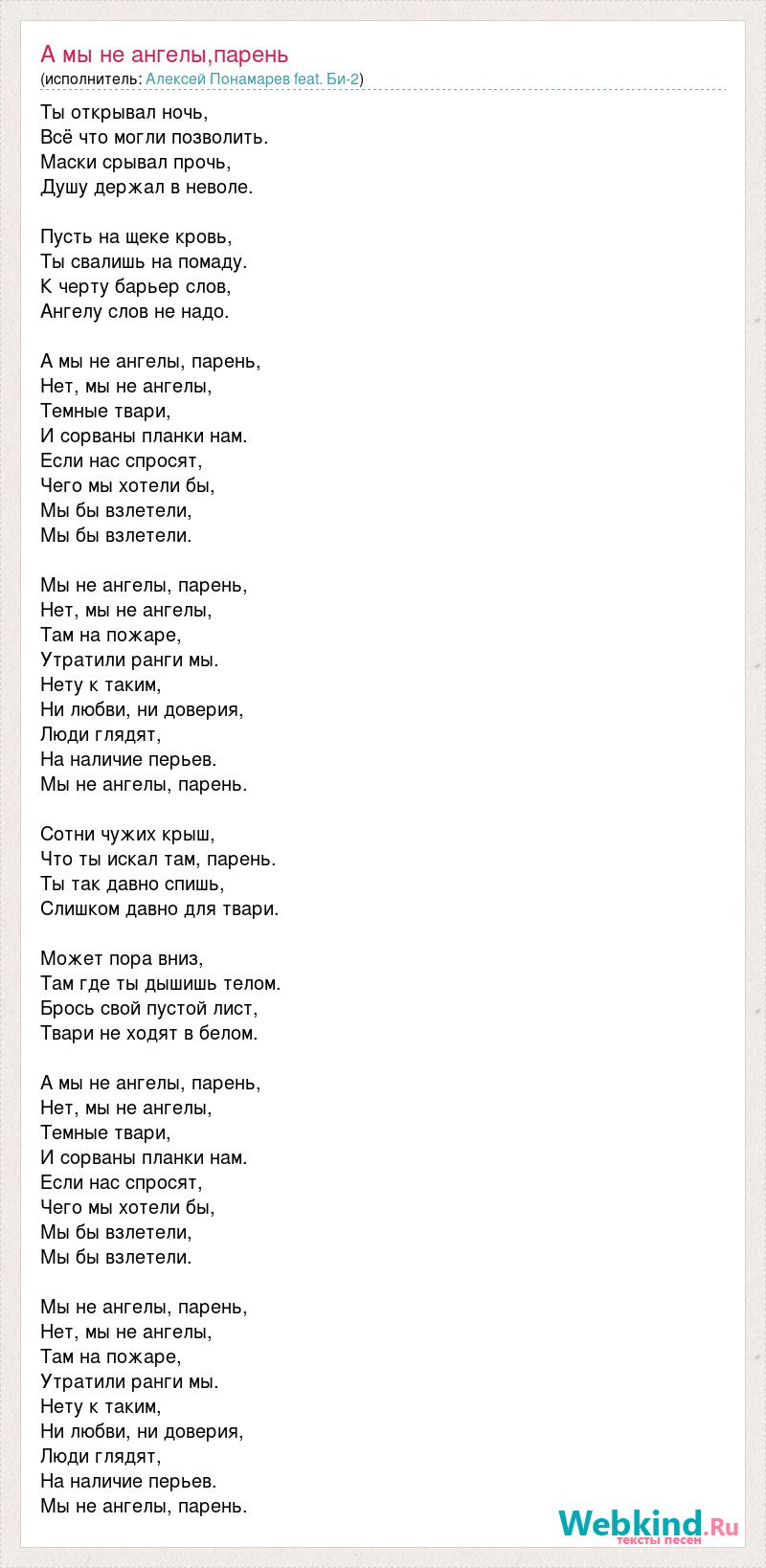 Ты открывал ночь, Всё что могли позволить. Маски срывал прочь, Душу держал в неволе. Пусть на щеке кровь, Ты свалишь на помаду. К черту барьер слов, Ангелу слов не надо. А мы не ангелы, парень, Нет, мы не ангелы, Темные твари, И сорваны планки нам. Если нас спросят, Чего мы хотели бы, Мы бы взлетели, Мы бы взлетели. Мы не ангелы, парень, Нет, мы не ангелы, Там на пожаре, Утратили ранги мы. Нету к таким, Ни любви, ни доверия, Люди глядят, На наличие перьев. Мы не ангелы, парень. Сотни чужих крыш, Что ты искал там, парень. Ты так давно спишь, Слишком давно для твари. Может пора вниз, Там где ты дышишь телом. Брось свой пустой лист, Твари не ходят в белом. А мы не ангелы, парень, Нет, мы не ангелы, Темные твари, И сорваны планки нам. Если нас спросят, Чего мы хотели бы, Мы бы взлетели, Мы бы взлетели. Мы не ангелы, парень, Нет, мы не ангелы, Там на пожаре, Утратили ранги мы. Нету к таким, Ни любви, ни доверия, Люди глядят, На наличие перьев. Мы не ангелы, парень.
