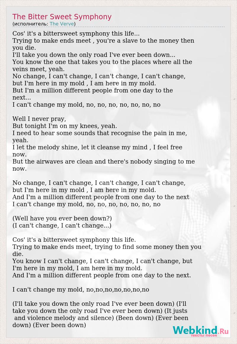 Cos' it's a bittersweet symphony this life... Trying to make ends meet , you're a slave to the money then you die. I'll take you down the only road I've ever been down... You know the one that takes you to the places where all the veins meet, yeah. No change, I can't change, I can't change, I can't change, but I'm here in my mold , I am here in my mold. But I'm a million different people from one day to the next... I can't change my mold, no, no, no, no, no, no, no Well I never pray, But tonight I'm on my knees, yeah. I need to hear some sounds that recognise the pain in me, yeah. I let the melody shine, let it cleanse my mind , I feel free now. But the airwaves are clean and there's nobody singing to me now. No change, I can't change, I can't change, I can't change, but I'm here in my mold , I am here in my mold. And I'm a million different people from one day to the next I can't change my mold, no, no, no, no, no, no, no (Well have you ever been down?) (I can't change, I can't change...) Cos' it's a bittersweet symphony this life. Trying to make ends meet, trying to find some money then you die. You know I can't change, I can't change, I can't change, but I'm here in my mold, I am here in my mold. And I'm a million different people from one day to the next. I can't change my mold, no,no,no,no,no,no,no (I'll take you down the only road I've ever been down) (I'll take you down the only road I've ever been down) (It justs and violence melody and silence) (Been down) (Ever been down) (Ever been down)