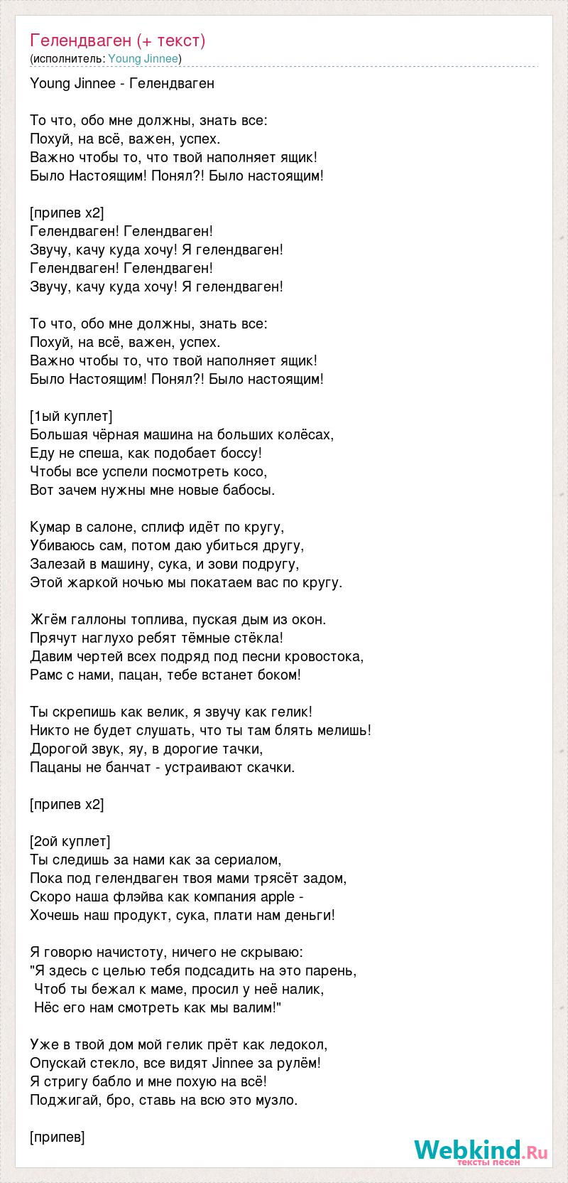 Young Jinnee - Гелендваген То что, обо мне должны, знать все: Похуй, на всё, важен, успех. Важно чтобы то, что твой наполняет ящик! Было Настоящим! Понял?! Было настоящим! [припев x2] Гелендваген! Гелендваген! Звучу, качу куда хочу! Я гелендваген! Гелендваген! Гелендваген! Звучу, качу куда хочу! Я гелендваген! То что, обо мне должны, знать все: Похуй, на всё, важен, успех. Важно чтобы то, что твой наполняет ящик! Было Настоящим! Понял?! Было настоящим! [1ый куплет] Большая чёрная машина на больших колёсах, Еду не спеша, как подобает боссу! Чтобы все успели посмотреть косо, Вот зачем нужны мне новые бабосы. Кумар в салоне, сплиф идёт по кругу, Убиваюсь сам, потом даю убиться другу, Залезай в машину, сука, и зови подругу, Этой жаркой ночью мы покатаем вас по кругу. Жгём галлоны топлива, пуская дым из окон. Прячут наглухо ребят тёмные стёкла! Давим чертей всех подряд под песни кровостока, Рамс с нами, пацан, тебе встанет боком! Ты скрепишь как велик, я звучу как гелик! Никто не будет слушать, что ты там блять мелишь! Дорогой звук, яу, в дорогие тачки, Пацаны не банчат - устраивают скачки. [припев х2] [2ой куплет] Ты следишь за нами как за сериалом, Пока под гелендваген твоя мами трясёт задом, Скоро наша флэйва как компания apple - Хочешь наш продукт, сука, плати нам деньги! Я говорю начистоту, ничего не скрываю: "Я здесь с целью тебя подсадить на это парень, Чтоб ты бежал к маме, просил у неё налик, Нёс его нам смотреть как мы валим!" Уже в твой дом мой гелик прёт как ледокол, Опускай стекло, все видят Jinnee за рулём! Я стригу бабло и мне похую на всё! Поджигай, бро, ставь на всю это музло. [припев]
