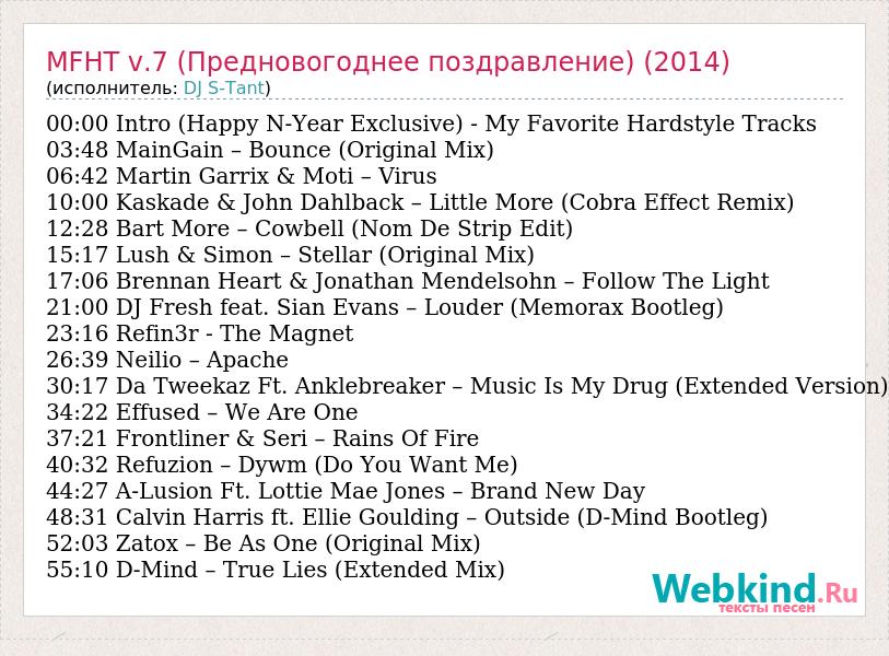 00:00 Intro (Happy N-Year Exclusive) - My Favorite Hardstyle Tracks 03:48 MainGain – Bounce (Original Mix) 06:42 Martin Garrix & Moti – Virus 10:00 Kaskade & John Dahlback – Little More (Cobra Effect Remix) 12:28 Bart More – Cowbell (Nom De Strip Edit) 15:17 Lush & Simon – Stellar (Original Mix) 17:06 Brennan Heart & Jonathan Mendelsohn – Follow The Light 21:00 DJ Fresh feat. Sian Evans – Louder (Memorax Bootleg) 23:16 Refin3r - The Magnet 26:39 Neilio – Apache 30:17 Da Tweekaz Ft. Anklebreaker – Music Is My Drug (Extended Version) 34:22 Effused – We Are One 37:21 Frontliner & Seri – Rains Of Fire 40:32 Refuzion – Dywm (Do You Want Me) 44:27 A-Lusion Ft. Lottie Mae Jones – Brand New Day 48:31 Calvin Harris ft. Ellie Goulding – Outside (D-Mind Bootleg) 52:03 Zatox – Be As One (Original Mix) 55:10 D-Mind – True Lies (Extended Mix)